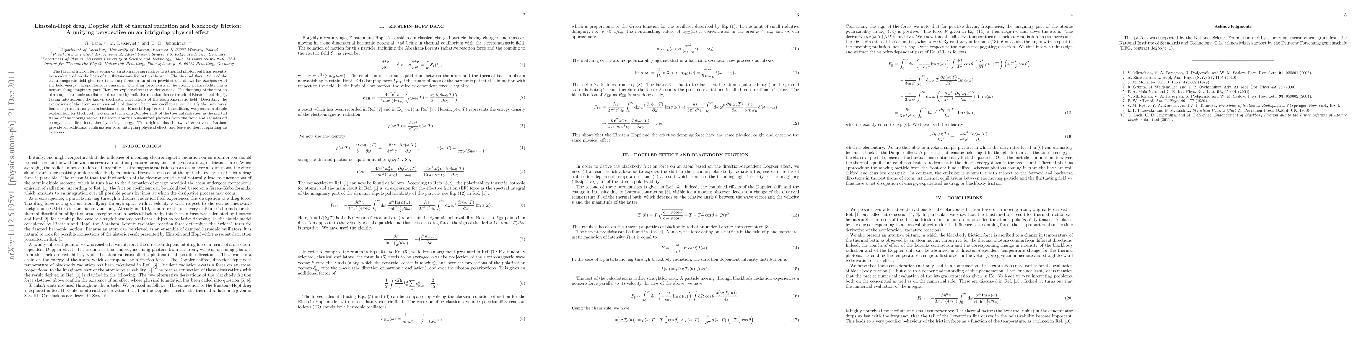 The thermal friction force acting on an atom moving relative to a thermal photon bath has recently been calculated on the basis of the fluctuation-dissipation theorem. The thermal fluctuations of the electromagnetic field give rise to a drag force on an atom provided one allows for dissipation of the field energy via spontaneous emission. The drag force exists if the atomic polarizability has a nonvanishing imaginary part. Here, we explore alternative derivations. The damping of the motion of a simple harmonic oscillator is described by radiative reaction theory (result of Einstein and Hopf), taking into account the known stochastic fluctuations of the electromagnetic field. Describing the excitations of the atom as an ensemble of damped harmonic oscillators, we identify the previously found expressions as generalizations of the Einstein-Hopf result. In addition, we present a simple explanation for blackbody friction in terms of a Doppler shift of the thermal radiation in the inertial frame of the moving atom: The atom absorbs blue-shifted photons from the front and radiates off energy in all directions, thereby losing energy. The original plus the two alternative derivations provide for additional confirmation of an intriguing physical effect, and leave no doubt regarding its existence.