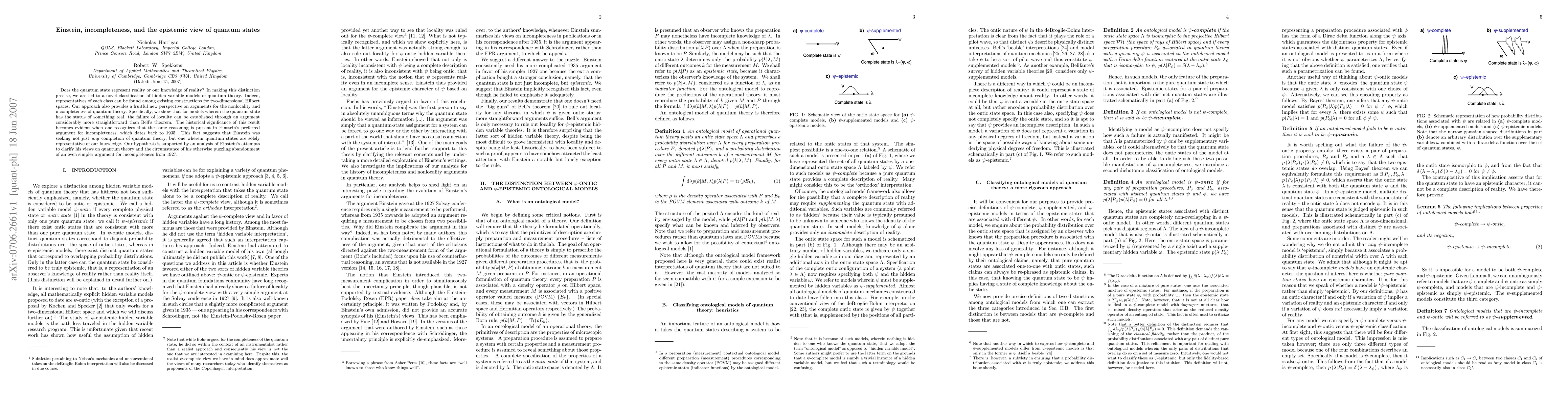 Does the quantum state represent reality or our knowledge of reality? In making this distinction precise, we are led to a novel classification of hidden variable models of quantum theory. Indeed, representatives of each class can be found among existing constructions for two-dimensional Hilbert spaces. Our approach also provides a fruitful new perspective on arguments for the nonlocality and incompleteness of quantum theory. Specifically, we show that for models wherein the quantum state has the status of something real, the failure of locality can be established through an argument considerably more straightforward than Bell's theorem. The historical significance of this result becomes evident when one recognizes that the same reasoning is present in Einstein's preferred argument for incompleteness, which dates back to 1935. This fact suggests that Einstein was seeking not just any completion of quantum theory, but one wherein quantum states are solely representative of our knowledge. Our hypothesis is supported by an analysis of Einstein's attempts to clarify his views on quantum theory and the circumstance of his otherwise puzzling abandonment of an even simpler argument for incompleteness from 1927.