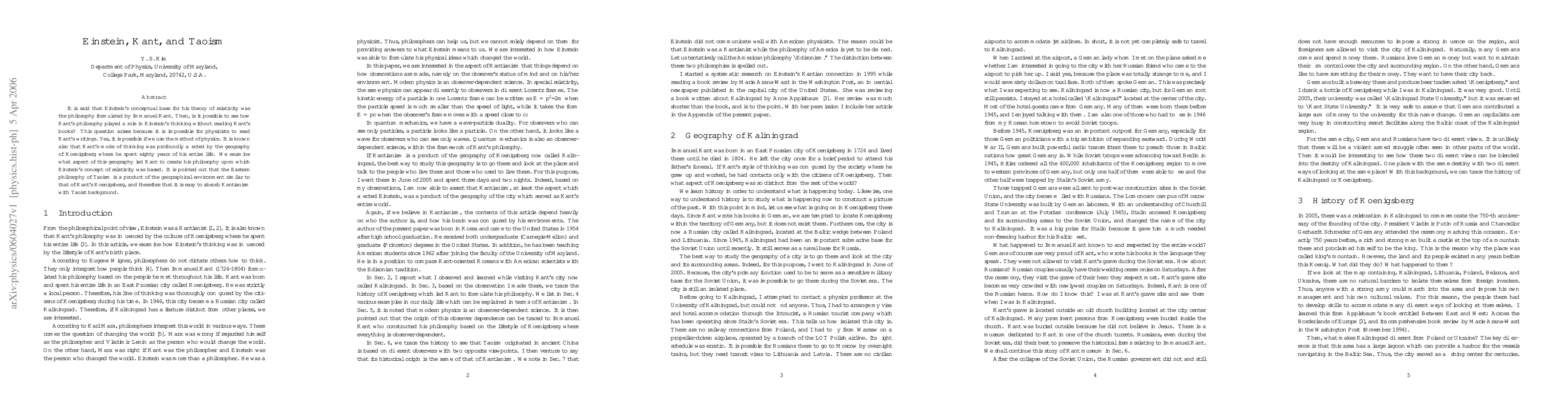 This paper explores the influence of Immanuel Kant's philosophy on Albert Einstein's theory of relativity, suggesting that understanding Kant's ideas can be achieved through physics rather than direct reading. It also draws parallels between Kant's geographical influences and the Eastern philosophy of Taoism, highlighting similarities between Kantianism and Taoism.