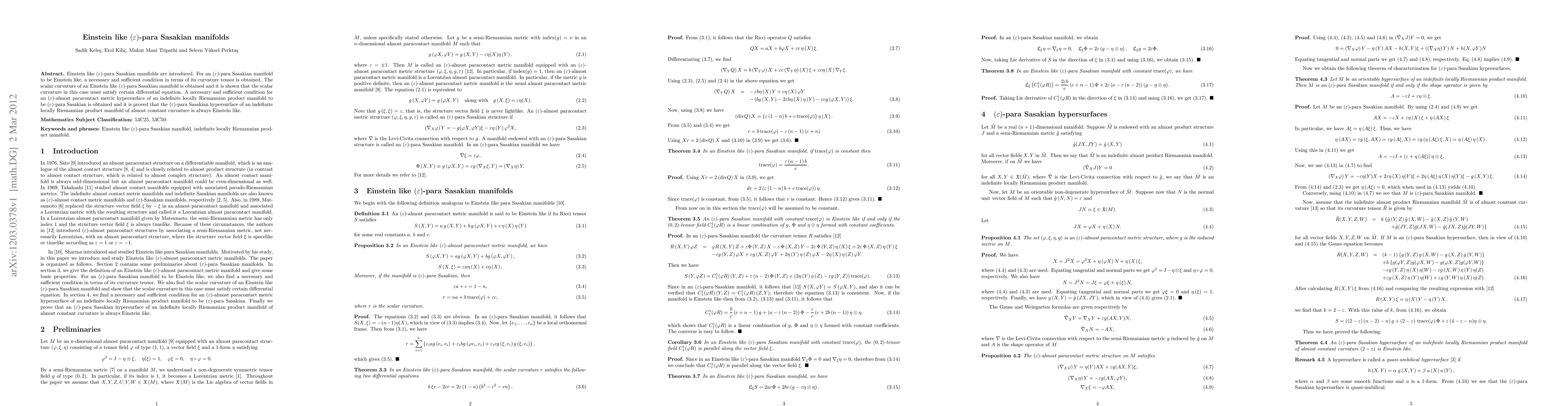 This paper introduces Einstein like $(\varepsilon)$-para Sasakian manifolds, deriving a necessary and sufficient condition for their Einstein-like property in terms of their curvature tensor. It also determines the scalar curvature and associated differential equations, and provides conditions for $(\varepsilon)$-para Sasakian hypersurfaces in indefinite locally Riemannian product manifolds, proving they are always Einstein like under almost constant curvature.