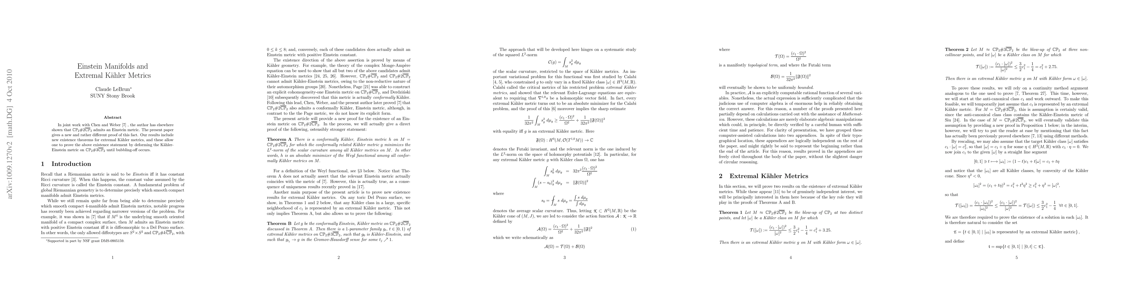 This paper presents a new proof for the existence of an Einstein metric on CP2#2(-CP2) and introduces existence theorems for extremal Kahler metrics, demonstrating the result through deformation of the Kahler-Einstein metric on CP2#3(-CP2) until bubbling-off occurs.