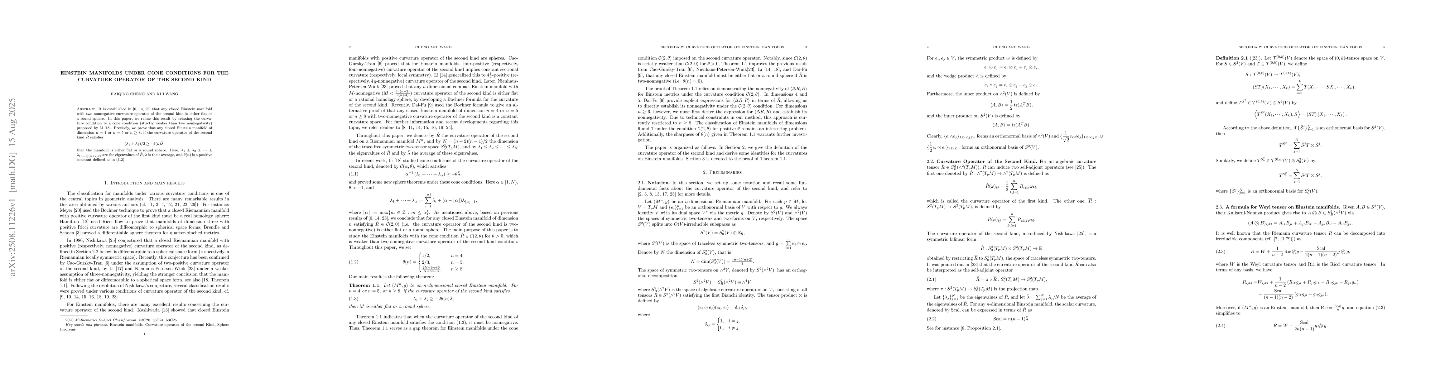 It is established in [6, 14, 23] that any closed Einstein manifold with two-nonnegative curvature operator of the second kind is either flat or a round sphere. In this paper, we refine this result by relaxing the curvature condition to a cone condition (strictly weaker than two nonnegativity) proposed by Li [18]. Precisely, we prove that any closed Einstein manifold of dimension $n=4$ or $n=5$ or $n\ge 8$, if the curvature operator of the second kind $\mathring{R}$ satisfies \begin{align*} (\lambda_1+\lambda_2)/2 \ge -\theta(n) \bar \lambda, \end{align*} then the manifold is either flat or a round sphere. Here, $\lambda_1\le \lambda_2\le \cdots\le \lambda_{(n-1)(n+2)/2}$ are the eigenvalues of $\mathring{R}$, $ \bar \lambda $ is their average, and $\theta(n)$ is a positive constant defined as in (1.2).