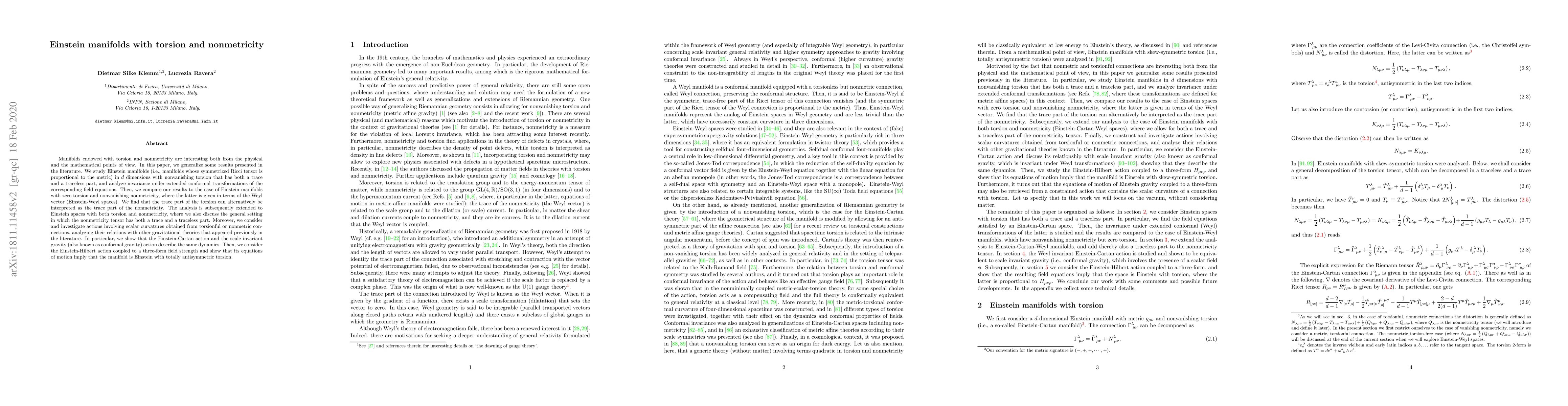 Manifolds endowed with torsion and nonmetricity are interesting both from the physical and the mathematical points of view. In this paper, we generalize some results presented in the literature. We study Einstein manifolds (i.e., manifolds whose symmetrized Ricci tensor is proportional to the metric) in d dimensions with nonvanishing torsion that has both a trace and a traceless part, and analyze invariance under extended conformal transformations of the corresponding field equations. Then, we compare our results to the case of Einstein manifolds with zero torsion and nonvanishing nonmetricity, where the latter is given in terms of the Weyl vector (Einstein-Weyl spaces). We find that the trace part of the torsion can alternatively be interpreted as the trace part of the nonmetricity. The analysis is subsequently extended to Einstein spaces with both torsion and nonmetricity, where we also discuss the general setting in which the nonmetricity tensor has both a trace and a traceless part. Moreover, we consider and investigate actions involving scalar curvatures obtained from torsionful or nonmetric connections, analyzing their relations with other gravitational theories that appeared previously in the literature. In particular, we show that the Einstein-Cartan action and the scale invariant gravity (also known as conformal gravity) action describe the same dynamics. Then, we consider the Einstein-Hilbert action coupled to a three-form field strength and show that its equations of motion imply that the manifold is Einstein with totally antisymmetric torsion.