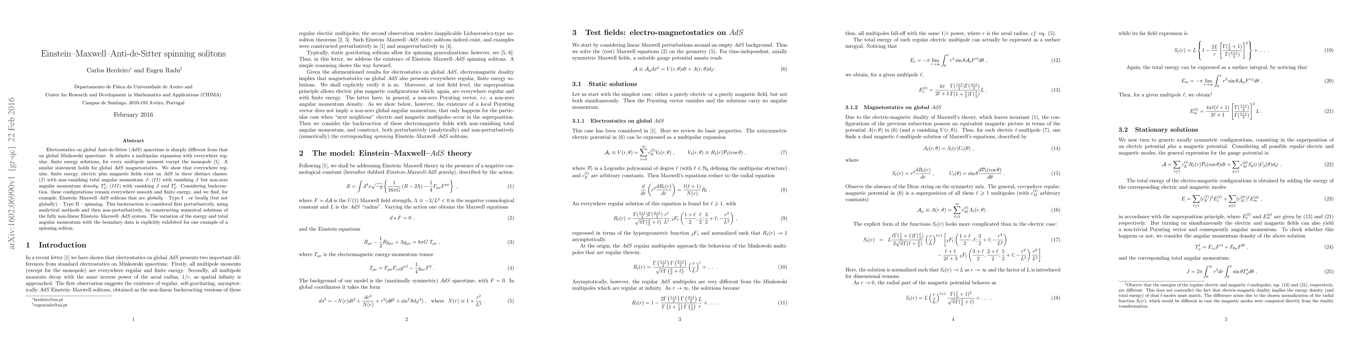 This paper investigates electric and magnetic fields in global Anti-de Sitter (AdS) spacetime, revealing three distinct classes of everywhere regular, finite energy solutions. These solutions are further examined under backreaction, yielding smooth, finite-energy solitons in three types: globally Type I or locally Type II spinning configurations.