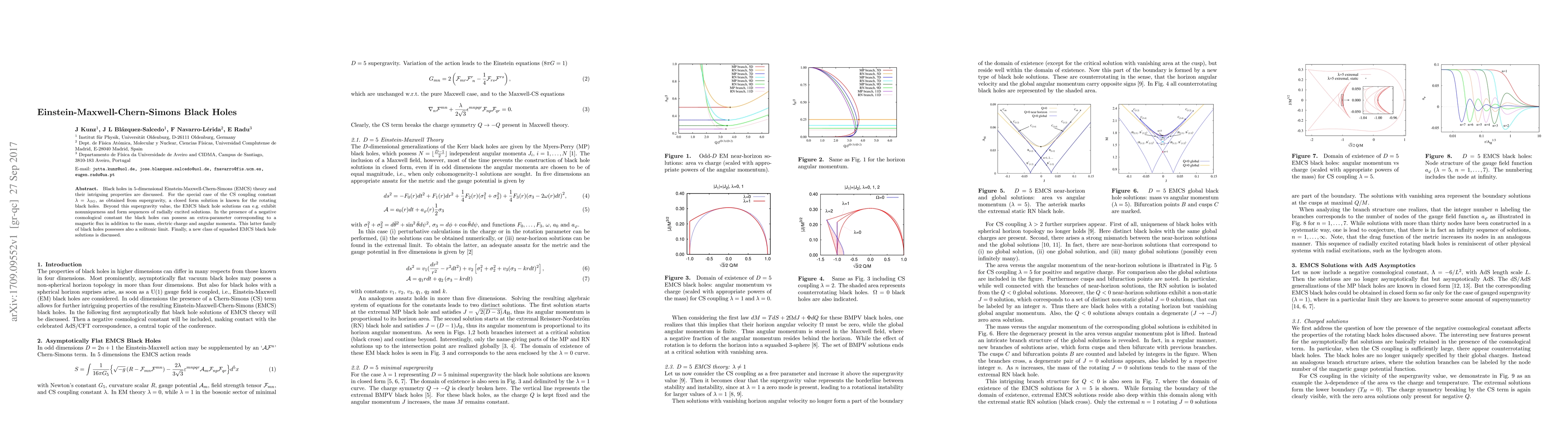 Black holes in 5-dimensional Einstein-Maxwell-Chern-Simons (EMCS) theory and their intriguing properties are discussed. For the special case of the CS coupling constant $\lambda=\lambda_{SG}$, as obtained from supergravity, a closed form solution is known for the rotating black holes. Beyond this supergravity value, the EMCS black hole solutions can e.g. exhibit nonuniqueness and form sequences of radially excited solutions. In the presence of a negative cosmological constant the black holes can possess an extra-parameter corresponding to a magnetic flux in addition to the mass, electric charge and angular momenta. This latter family of black holes possesses also a solitonic limit. Finally, a new class of squashed EMCS black hole solutions is discussed.