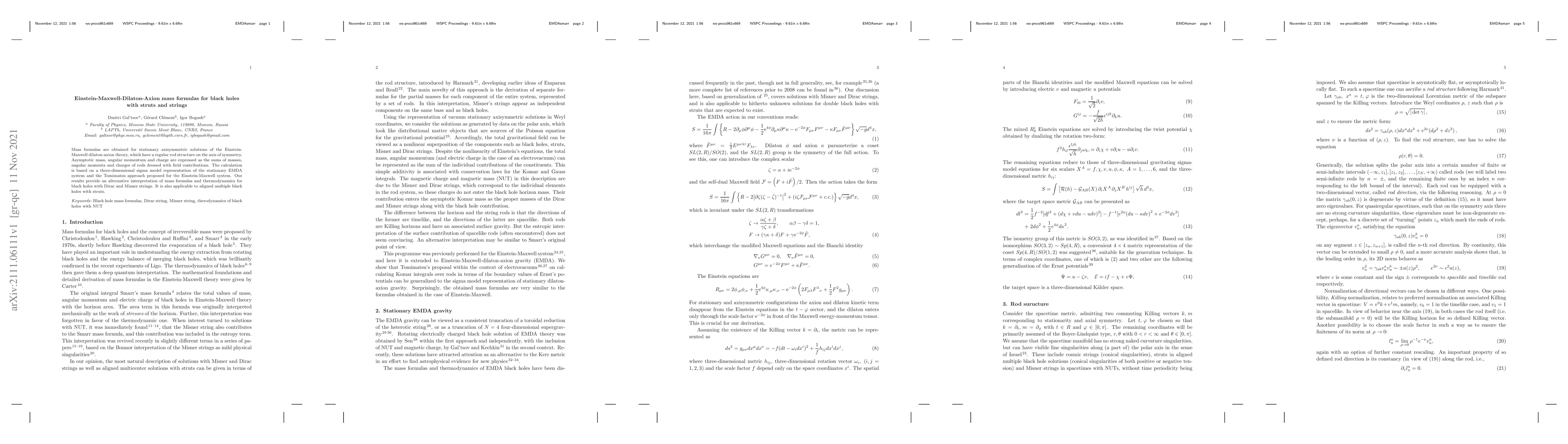 This paper derives mass formulas for black holes in Einstein-Maxwell-dilaton-axion theory with struts and strings, using a three-dimensional sigma model and Tomimatsu approach. The results offer an alternative interpretation of mass, angular momentum, and charge contributions from rods and field effects.
