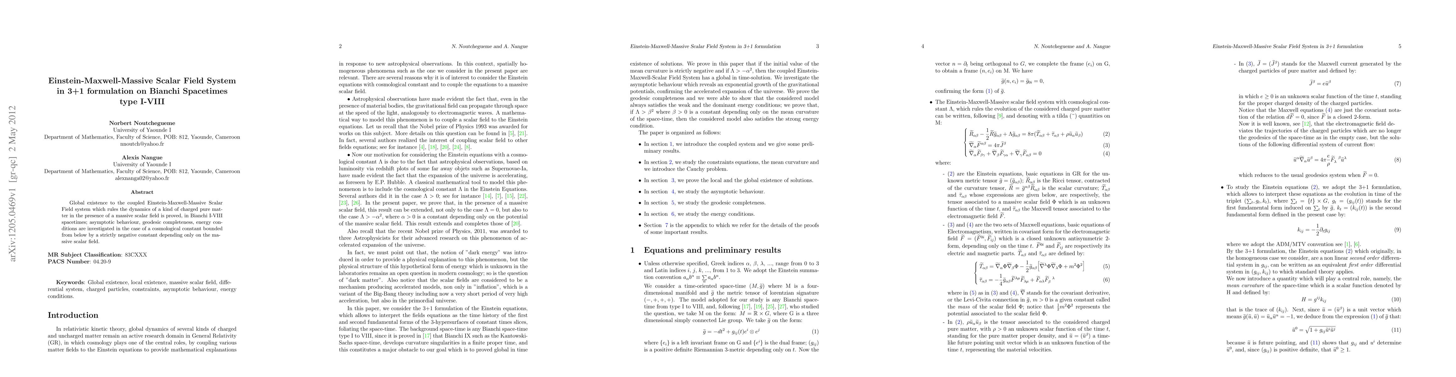 This paper proves global existence for the Einstein-Maxwell-Massive Scalar Field system in Bianchi I-VIII spacetimes, examining asymptotic behavior, geodesic completeness, and energy conditions under a cosmological constant bounded by a negative constant related to the scalar field.