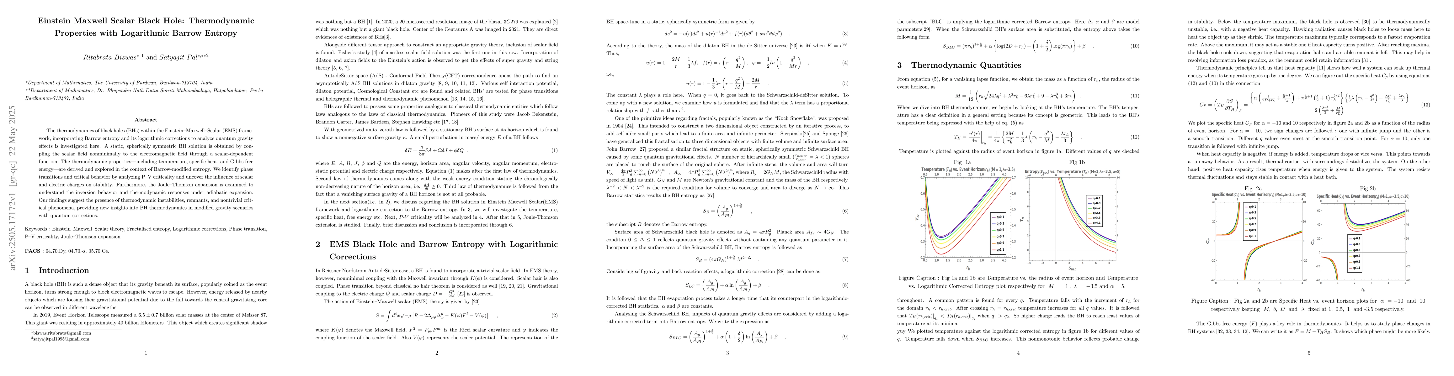 The paper presents a detailed analysis of thermodynamic properties of Einstein Maxwell Scalar black holes with logarithmic Barrow entropy, identifying phase transitions and critical behavior.