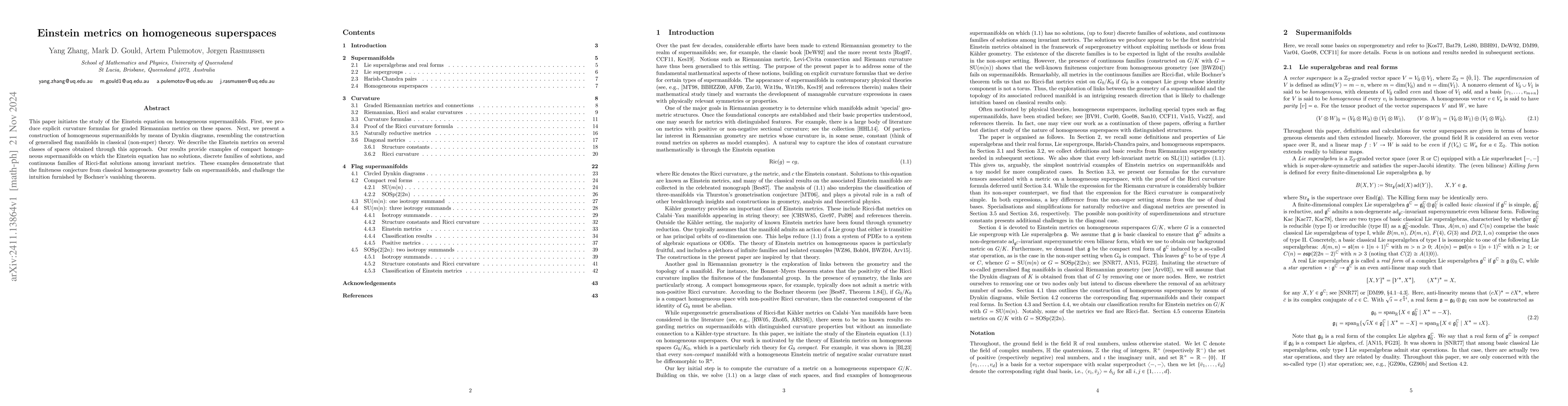 This paper investigates Einstein metrics on homogeneous supermanifolds, deriving explicit curvature formulas and constructing such manifolds via Dynkin diagrams. It finds that, unlike classical geometry, supermanifolds exhibit diverse Einstein metric solutions, invalidating the finiteness conjecture.