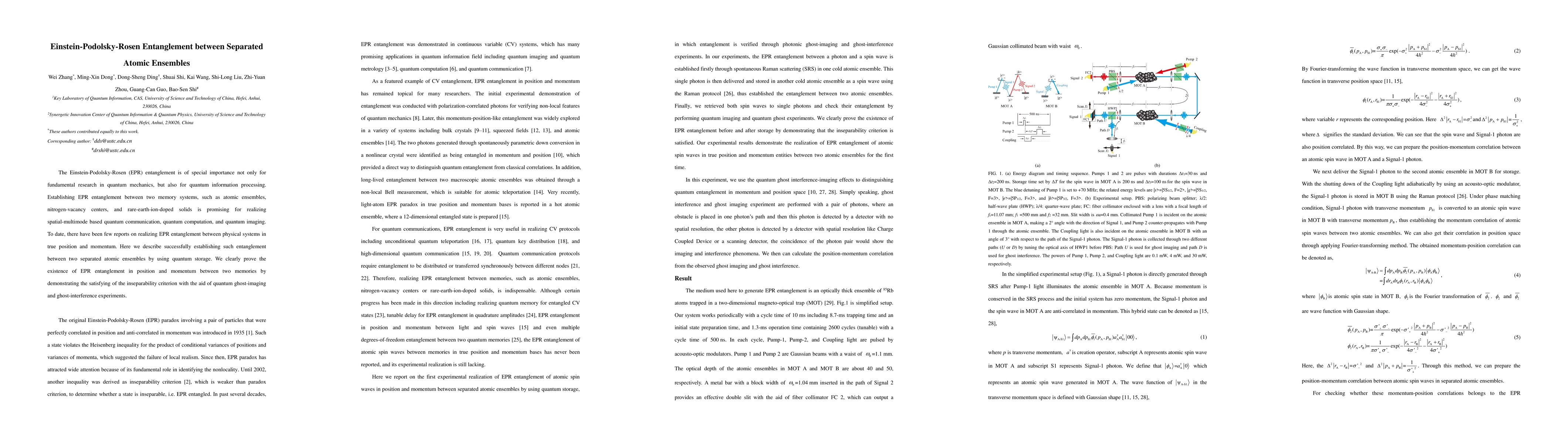 This paper reports the successful establishment of Einstein-Podolsky-Rosen (EPR) entanglement between two spatially separated atomic ensembles using quantum storage. The authors demonstrate the existence of this entanglement through quantum ghost-imaging and ghost-interference experiments, confirming the inseparability criterion.