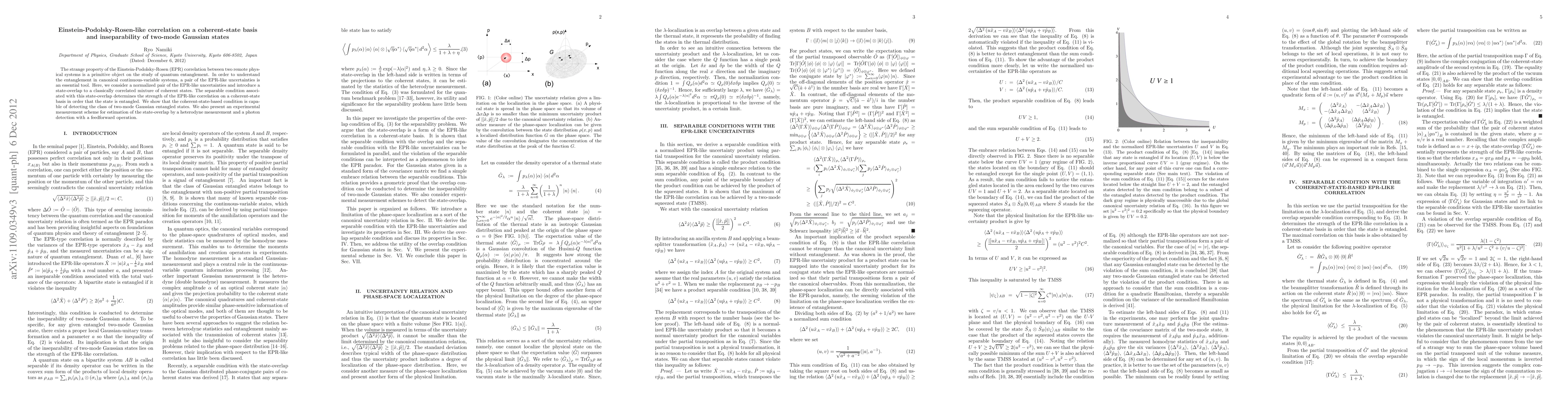 This paper investigates the EPR-like correlation in continuous-variable quantum systems, introducing a method to detect entanglement in two-mode Gaussian states through a coherent-state-based condition. An experimental scheme utilizing heterodyne measurement and photon detection is proposed for estimating the state-overlap.