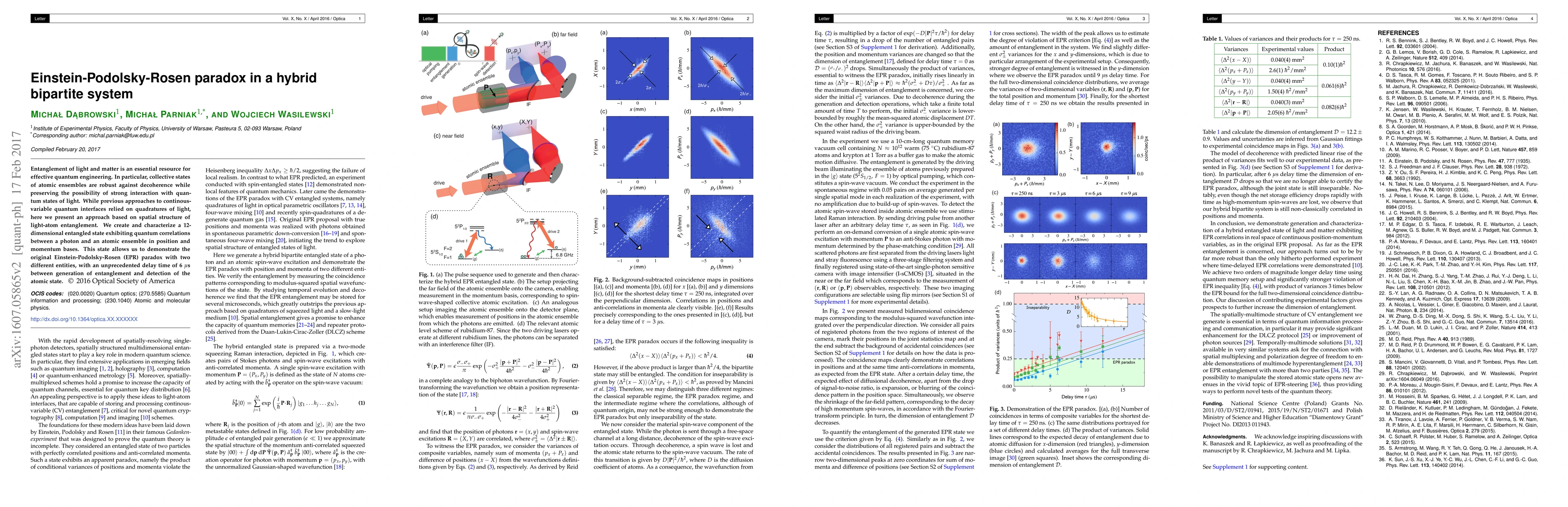 This paper explores entanglement between light and matter in a hybrid bipartite system, creating a 12-dimensional entangled state between a photon and an atomic ensemble. The study demonstrates the Einstein-Podolsky-Rosen paradox using spatial structure of light-atom entanglement, with a notable 6 $\mu$s delay between entanglement generation and atomic state detection.