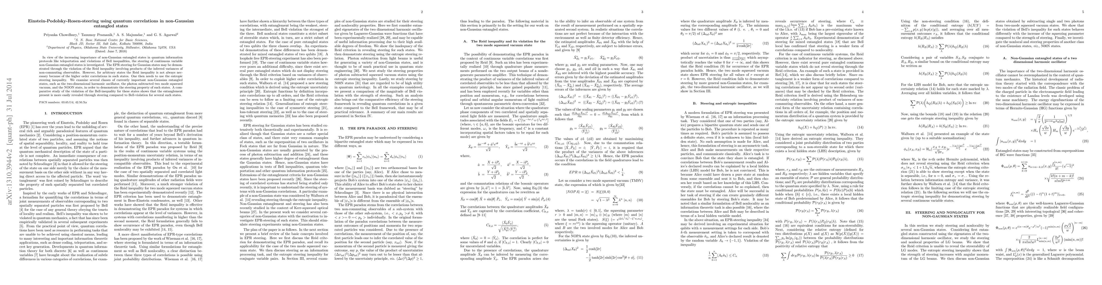 In view of the increasing importance of non-Gaussian entangled states in quantum information protocols like teleportation and violations of Bell inequalities, the steering of continuous variable non-Gaussian entangled states is investigated. The EPR steering for Gaussian states may be demonstrated through the violation of the Reid inequality involving products of the inferred variances of non-commuting observables. However, for arbitrary states the Reid inequality is not always necessary because of the higher order correlations in such states. One then needs to use the entropic steering inequality. We examine several classes of currently important non-Gaussian entangled states, such as the two-dimensional harmonic oscillator, the photon subtracted two mode squeezed vacuum, and the NOON state, in order to demonstrate the steering property of such states. A comparative study of the violation of the Bell-inequality for these states shows that the entanglement present is more easily revealed through steering compared to Bell-violation for several such states.