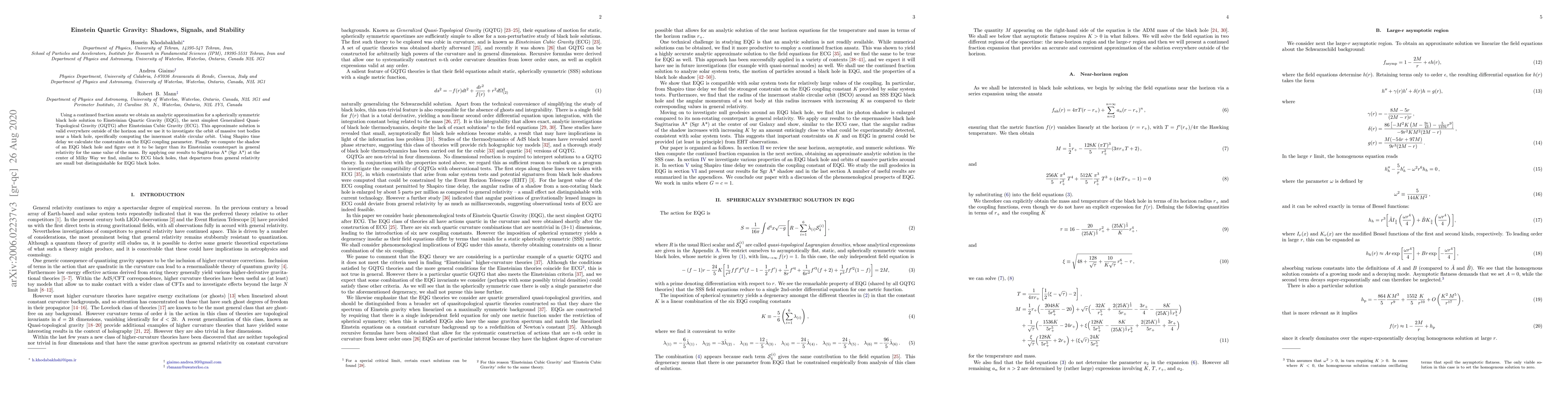 Using a continued fraction ansatz we obtain an analytic approximation for a spherically symmetric black hole solution to Einsteinian Quartic Gravity (EQG), the next simplest Generalized Quasi-Topological Gravity (GQTG) after Einsteinian Cubic Gravity (ECG). This approximate solution is valid everywhere outside of the horizon and we use it to investigate the orbit of massive test bodies near a black hole, specifically computing the innermost stable circular orbit. Using Shapiro time delay we calculate the constraints on the EQG coupling parameter. Finally we compute the shadow of an EQG black hole and figure out it to be larger than its Einsteinian counterpart in general relativity for the same value of the mass. By applying our results to Sagittarius A* (Sgr A*) at the center of Milky Way we find, similar to ECG black holes, that departures from general relativity are small but distinguishable for EQG black holes.