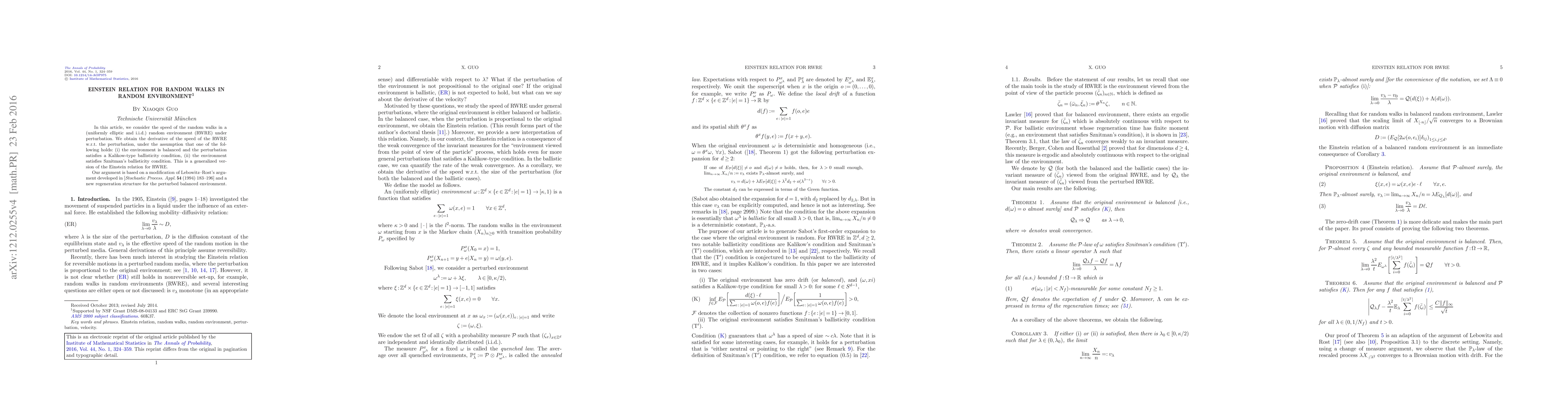 This paper generalizes the Einstein relation for random walks in a random environment by deriving the derivative of the walk speed concerning perturbations. It applies under conditions of balanced or Sznitman-type ballisticity, using a modified Lebowitz-Rost argument and a new regeneration structure.