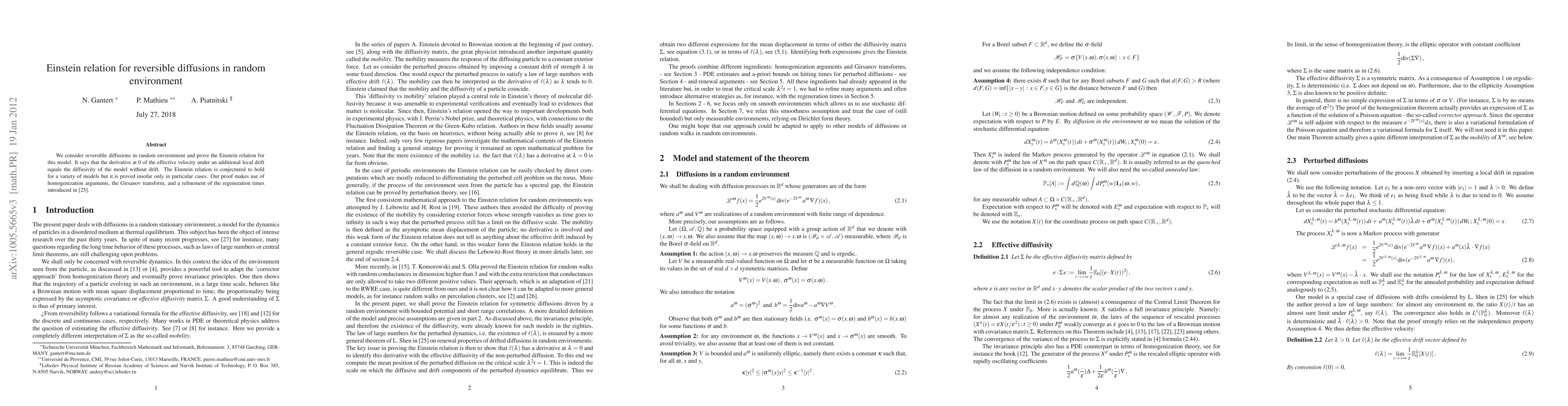 This paper proves the Einstein relation for reversible diffusions in random environments, showing that the effective velocity derivative under local drift equals the model's diffusivity without drift. The proof employs homogenization, the Girsanov transform, and a refinement of regeneration times.
