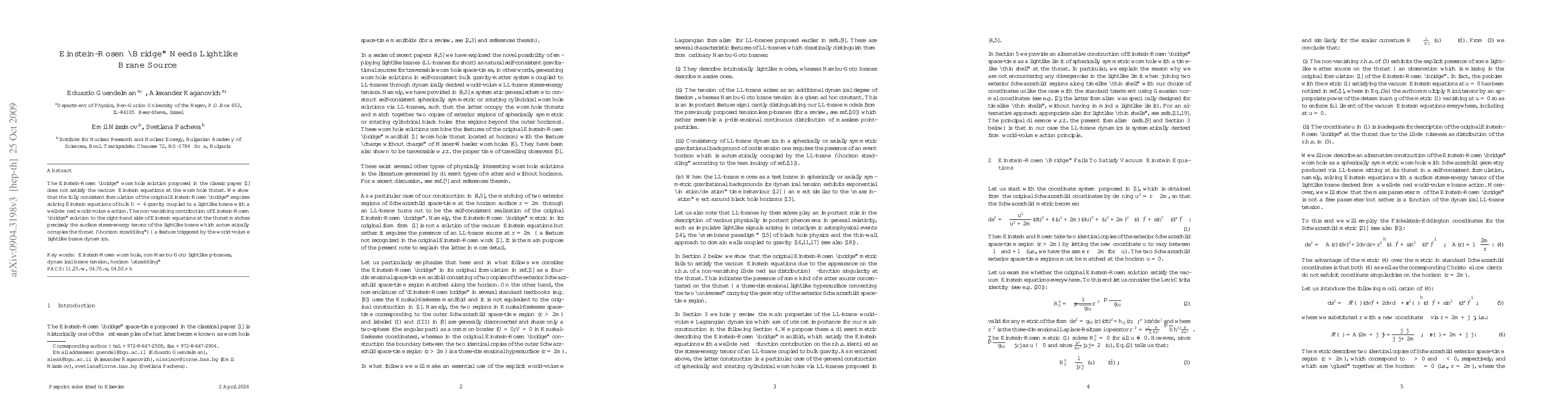 This paper demonstrates that the Einstein-Rosen wormhole solution requires a lightlike brane at its throat to satisfy the vacuum Einstein equations. The consistent formulation involves solving the Einstein equations in D=4 gravity coupled to a lightlike brane, whose surface stress-energy tensor precisely matches the wormhole's throat contribution.