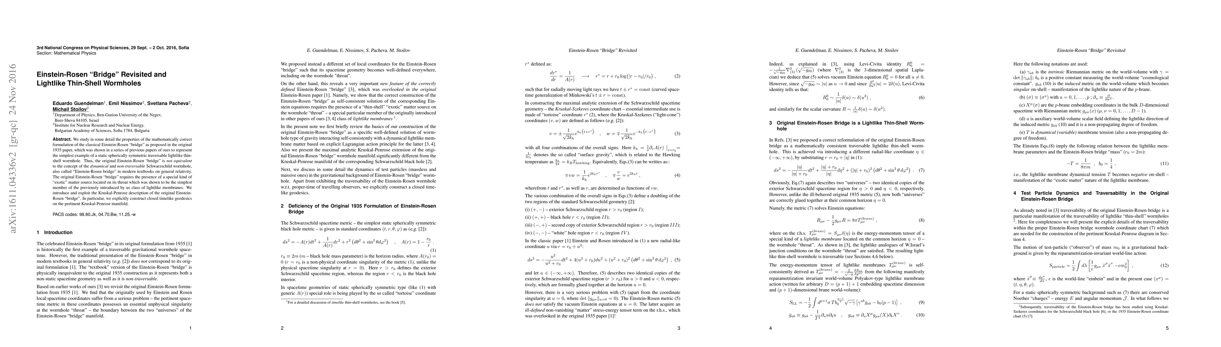 This paper revisits the original 1935 Einstein-Rosen "bridge" concept, demonstrating it as a static, spherically symmetric, traversable lightlike thin-shell wormhole requiring exotic matter, distinct from the dynamical Schwarzschild wormhole. The authors employ Kruskal-Penrose coordinates to construct closed timelike geodesics.