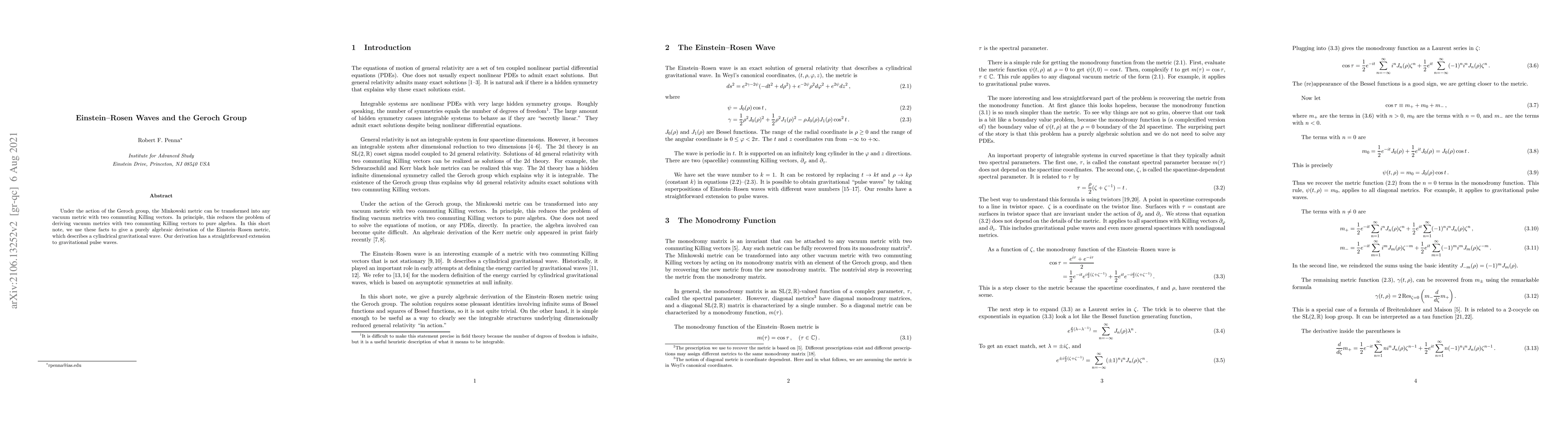 Under the action of the Geroch group, the Minkowski metric can be transformed into any vacuum metric with two commuting Killing vectors. In principle, this reduces the problem of deriving vacuum metrics with two commuting Killing vectors to pure algebra. In this short note, we use these facts to give a purely algebraic derivation of the Einstein-Rosen metric, which describes a cylindrical gravitational wave. Our derivation has a straightforward extension to gravitational pulse waves.