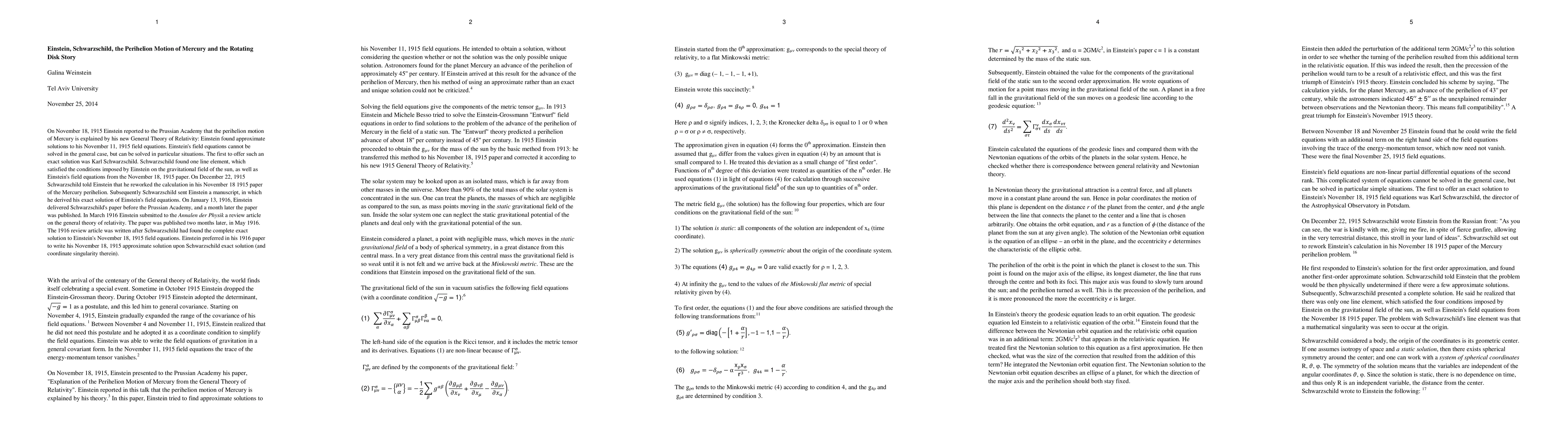 On November 18, 1915 Einstein reported to the Prussian Academy that the perihelion motion of Mercury is explained by his new General Theory of Relativity: Einstein found approximate solutions to his November 11, 1915 field equations. Einstein's field equations cannot be solved in the general case, but can be solved in particular situations. The first to offer such an exact solution was Karl Schwarzschild. Schwarzschild found one line element, which satisfied the conditions imposed by Einstein on the gravitational field of the sun, as well as Einstein's field equations from the November 18, 1915 paper. On December 22, 1915 Schwarzschild told Einstein that he reworked the calculation in his November 18 1915 paper of the Mercury perihelion. Subsequently Schwarzschild sent Einstein a manuscript, in which he derived his exact solution of Einstein's field equations. On January 13, 1916, Einstein delivered Schwarzschild's paper before the Prussian Academy, and a month later the paper was published. In March 1916 Einstein submitted to the Annalen der Physik a review article on the general theory of relativity. The paper was published two months later, in May 1916. The 1916 review article was written after Schwarzschild had found the complete exact solution to Einstein's November 18, 1915 field equations. Einstein preferred in his 1916 paper to write his November 18, 1915 approximate solution upon Schwarzschild exact solution (and coordinate singularity therein).