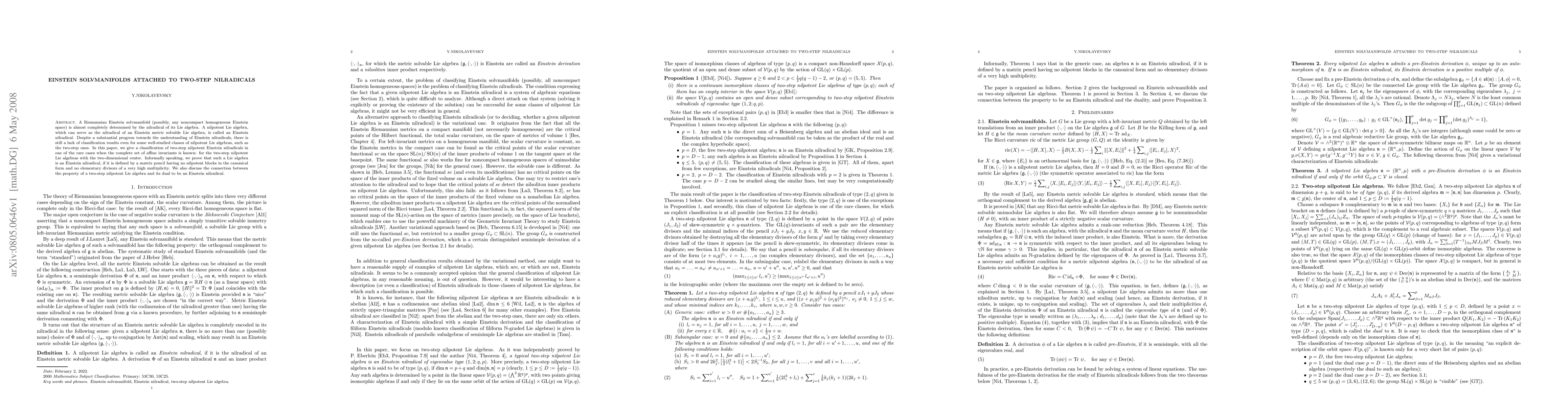 This paper classifies two-step nilpotent Einstein nilradicals with a two-dimensional center, showing they are defined by matrix pencils without high multiplicity elementary divisors. It also explores the relationship between such Lie algebras and their duals being Einstein nilradicals.