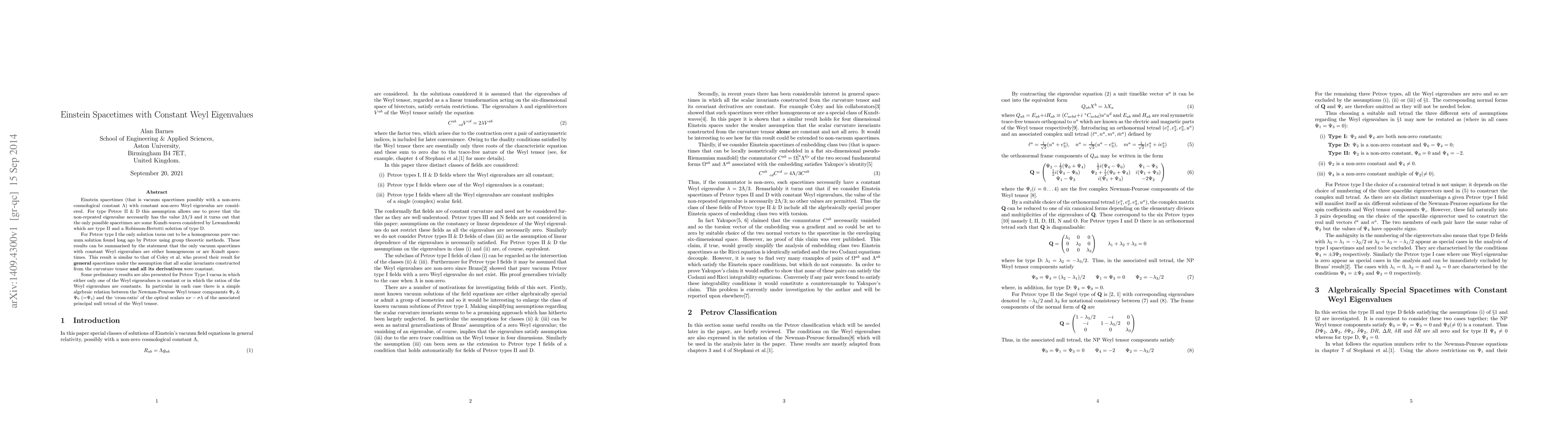 Einstein spacetimes (that is vacuum spacetimes possibly with a non-zero cosmological constant {\Lambda}) with constant non-zero Weyl eigenvalus are considered. For type Petrov II & D this assumption allows one to prove that the non-repeated eigenvalue necessarily has the value 2{\Lambda}/3 and it turns out that the only possible spacetimes are some Kundt-waves considered by Lewandowski which are type II and a Robinson-Bertotti solution of type D. For Petrov type I the only solution turns out to be a homogeneous pure vacuum solution found long ago by Petrov using group theoretic methods. These results can be summarised by the statement that the only vacuum spacetimes with constant Weyl eigenvalues are either homogeneous or are Kundt space- times. This result is similar to that of Coley et al. who proved their result for general spacetimes under the assumption that all scalar invariants constructed from the curvature tensor and all its derivatives were constant. Some preliminary results are also presented for Petrov Type I vacua in which either only one of the Weyl eigenvalues is constant or in which the ratios of the Weyl eigenvalues are constants. In particular in each case there is a simple algebraic relation between the Newman-Penrose Weyl tensor components $\Psi_2$ & $\Psi_0 (=\Psi_4)$ and the 'cross-ratio' of the optical scalars {\kappa}{\nu}-{\sigma}{\lambda} of the associated principal null tetrad of the Weyl tensor.