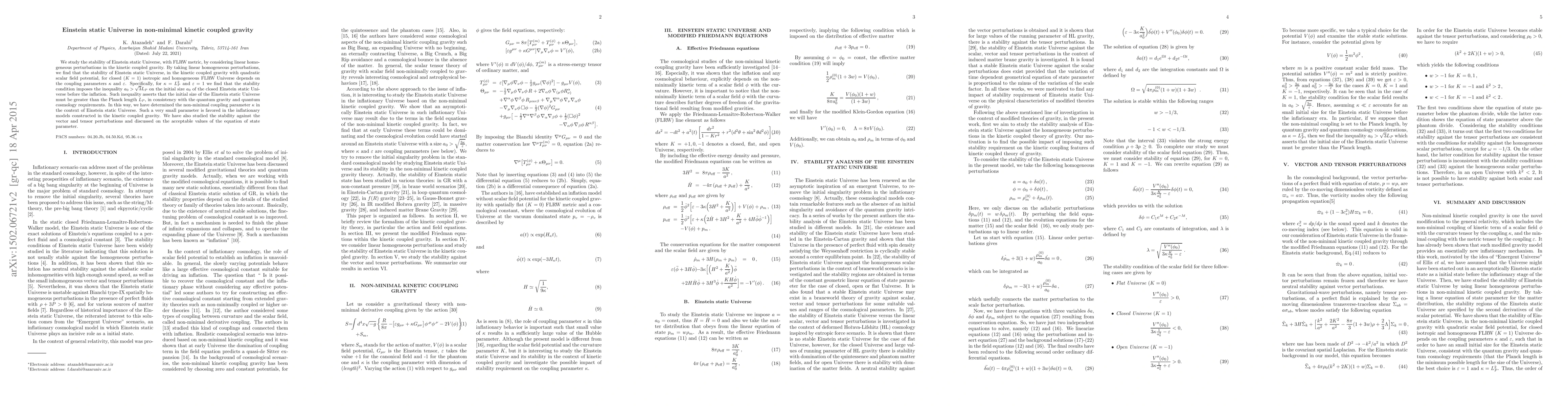 We study the stability of Einstein static Universe, with FLRW metric, by considering linear homogeneous perturbations in the kinetic coupled gravity. By taking linear homogeneous perturbations, we find that the stability of Einstein static Universe, in the kinetic coupled gravity with quadratic scalar field potential, for closed ($K=1$) isotropic and homogeneous FLRW Universe depends on the coupling parameters $\kappa$ and $\varepsilon$. Specifically, for $\kappa=L_P^2$ and $\varepsilon=1$ we find that the stability condition imposes the inequality $a_0>\sqrt{3}L_P$ on the initial size $a_0$ of the closed Einstein static Universe before the inflation. Such inequality asserts that the initial size of the Einstein static Universe must be greater than the Planck length $L_P$, in consistency with the quantum gravity and quantum cosmology requirements. In this way, we have determined the non-minimal coupling parameter $\kappa$ in the context of Einstein static Universe. Such a very small parameter is favored in the inflationary models constructed in the kinetic coupled gravity. We have also studied the stability against the vector and tensor perturbations and discussed on the acceptable values of the equation of state parameter.