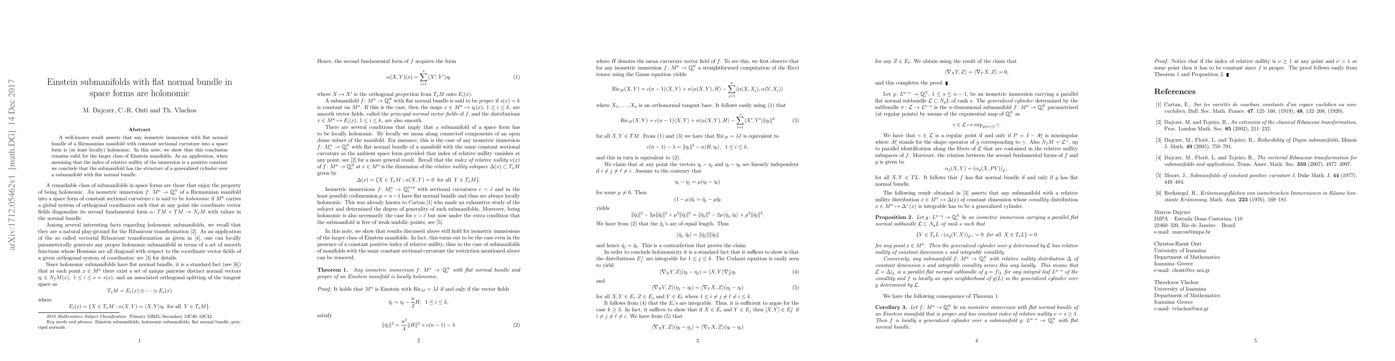 Summary: This paper proves that Einstein submanifolds with a flat normal bundle immersed in space forms are holonomic, extending the result to a broader class of manifolds. It also shows that under a constant index of relative nullity, the submanifold exhibits a generalized cylindrical structure.