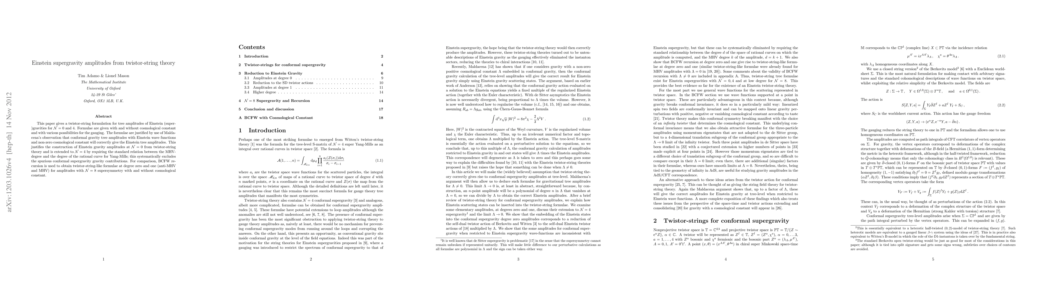 This paper gives a twistor-string formulation for all tree amplitudes of Einstein (super-)gravities for N=0 and 4. Formulae are given with and without cosmological constant and with various possibilities for the gauging. The formulae are justified by use of Maldacena's observation that conformal gravity tree amplitudes with Einstein wave functions and non-zero cosmological constant will correctly give the Einstein tree amplitudes. This justifies the construction of Einstein gravity amplitudes at N=0 from twistor-string theory and is extended to N=4 by requiring the standard relation between the MHV-degree and the degree of the rational curve for Yang-Mills; this systematically excludes the spurious conformal supergravity gravity contributions. For comparison, BCFW recursion is used to obtain twistor-string-like formulae at degree zero and one (anti-MHV and MHV) for amplitudes with N=8 supersymmetry with and without cosmological constant.