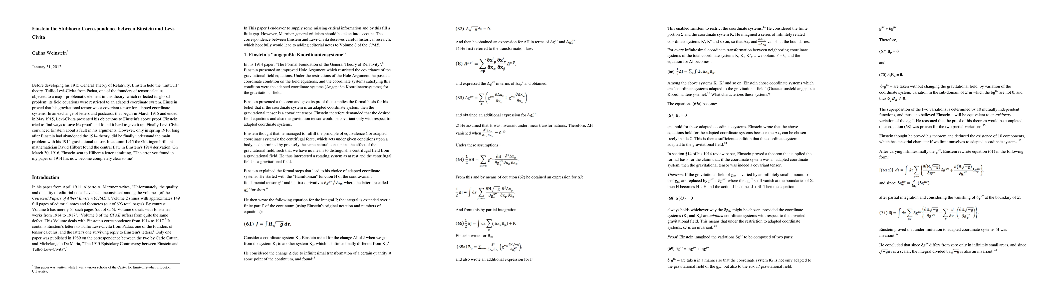 Before developing his 1915 General Theory of Relativity, Einstein held the "Entwurf" theory. Tullio Levi-Civita from Padua, one of the founders of tensor calculus, objected to a major problematic element in this theory, which reflected its global problem: its field equations were restricted to an adapted coordinate system. Einstein proved that his gravitational tensor was a covariant tensor for adapted coordinate systems. In an exchange of letters and postcards that began in March 1915 and ended in May 1915, Levi-Civita presented his objections to Einstein's above proof. Einstein tried to find ways to save his proof, and found it hard to give it up. Finally Levi-Civita convinced Einstein about a fault in his arguments. However, only in spring 1916, long after Einstein had abandoned the 1914 theory, did he finally understand the main problem with his 1914 gravitational tensor. In autumn 1915 the G\"ottingen brilliant mathematician David Hilbert found the central flaw in Einstein's 1914 derivation. On March 30, 1916, Einstein sent to Hilbert a letter admitting, "The error you found in my paper of 1914 has now become completely clear to me".