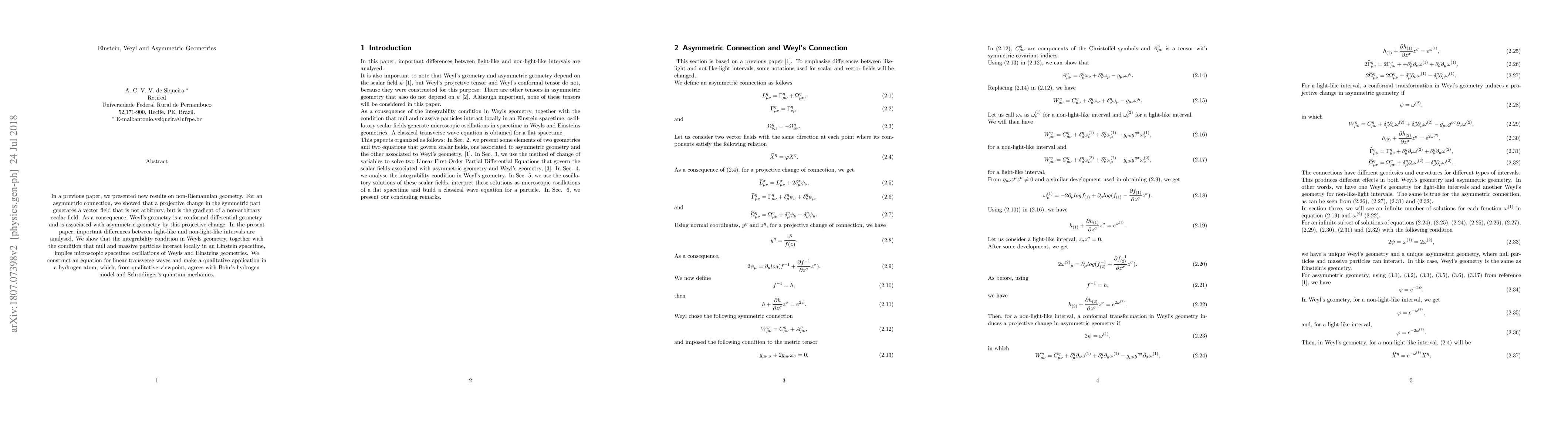In a previous paper, we presented new results on non-Riemannian geometry. For an asymmetric connection, we showed that a projective change in the symmetric part generates a vector field that is not arbitrary, but is the gradient of a non-arbitrary scalar field. As a consequence, Weyl's geometry is a conformal differential geometry and is associated with asymmetric geometry by this projective change. In the present paper, important differences between light-like and non-light-like intervals are analysed. We show that integrability condition in Weyl's geometry implies microscopic spacetime oscillations of Weyl's and Einstein's geometries. We show that the integrability condition in Weyl's geometry, together with the condition that null and massive particles interact locally in an Einstein spacetime. We construct an equation for linear transverse waves and make a qualitative application in a hydrogen atom, which, from qualitative viewpoint, agrees with Bohr's hydrogen model and Schrodinger's quantum mechanics.