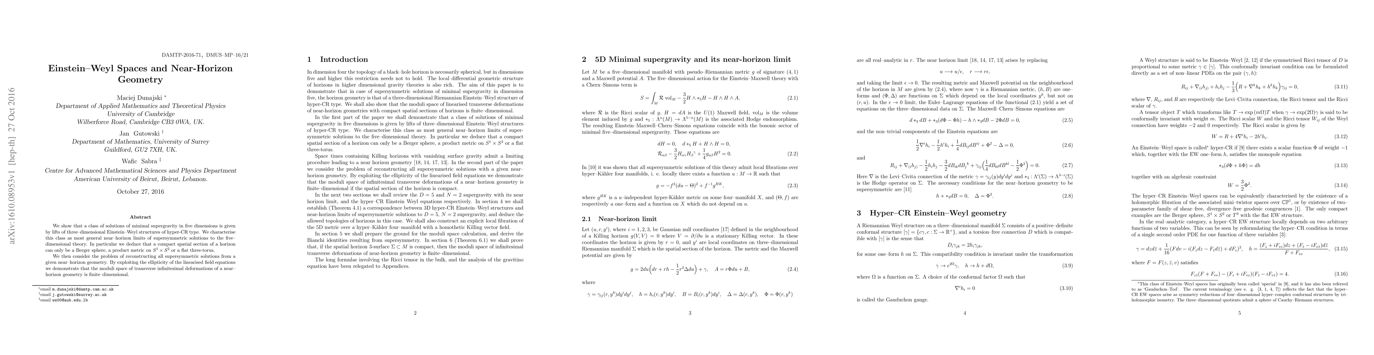 We show that a class of solutions of minimal supergravity in five dimensions is given by lifts of three--dimensional Einstein--Weyl structures of hyper-CR type. We characterise this class as most general near--horizon limits of supersymmetric solutions to the five--dimensional theory. In particular, we deduce that a compact spatial section of a horizon can only be a Berger sphere, a product metric on $S^1\times S^2$ or a flat three-torus. We then consider the problem of reconstructing all supersymmetric solutions from a given near--horizon geometry. By exploiting the ellipticity of the linearised field equations we demonstrate that the moduli space of transverse infinitesimal deformations of a near--horizon geometry is finite--dimensional.