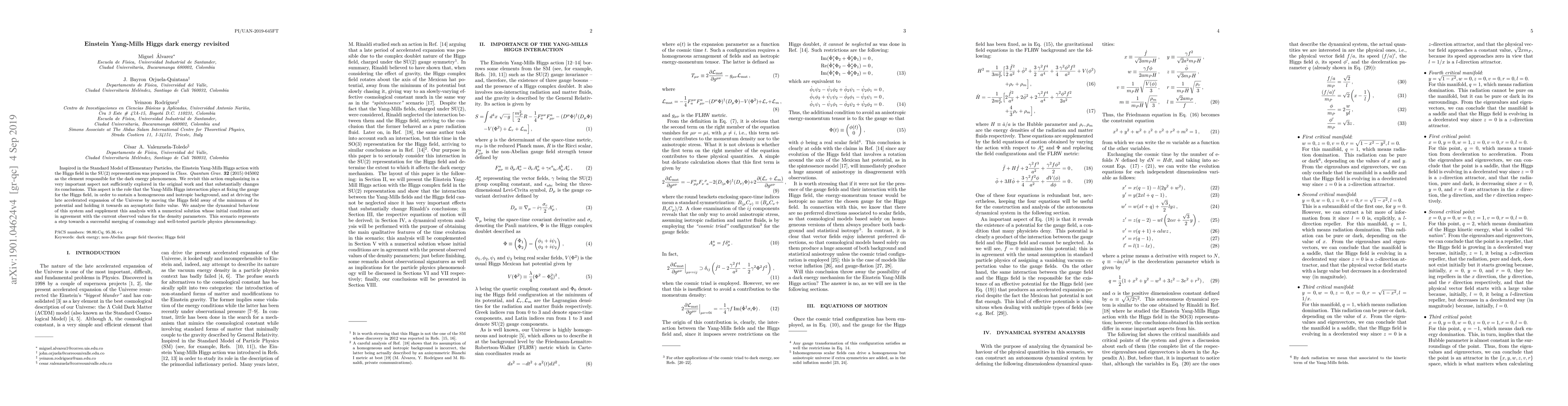 Inspired in the Standard Model of Elementary Particles, the Einstein Yang-Mills Higgs action with the Higgs field in the SU(2) representation was proposed in Class. Quantum Grav. 32 (2015) 045002 as the element responsible for the dark energy phenomenon. We revisit this action emphasizing in a very important aspect not sufficiently explored in the original work and that substantially changes its conclusions. This aspect is the role that the Yang-Mills Higgs interaction plays at fixing the gauge for the Higgs field, in order to sustain a homogeneous and isotropic background, and at driving the late accelerated expansion of the Universe by moving the Higgs field away of the minimum of its potential and holding it towards an asymptotic finite value. We analyse the dynamical behaviour of this system and supplement this analysis with a numerical solution whose initial conditions are in agreement with the current observed values for the density parameters. This scenario represents a step towards a successful merging of cosmology and well-tested particle physics phenomenology.