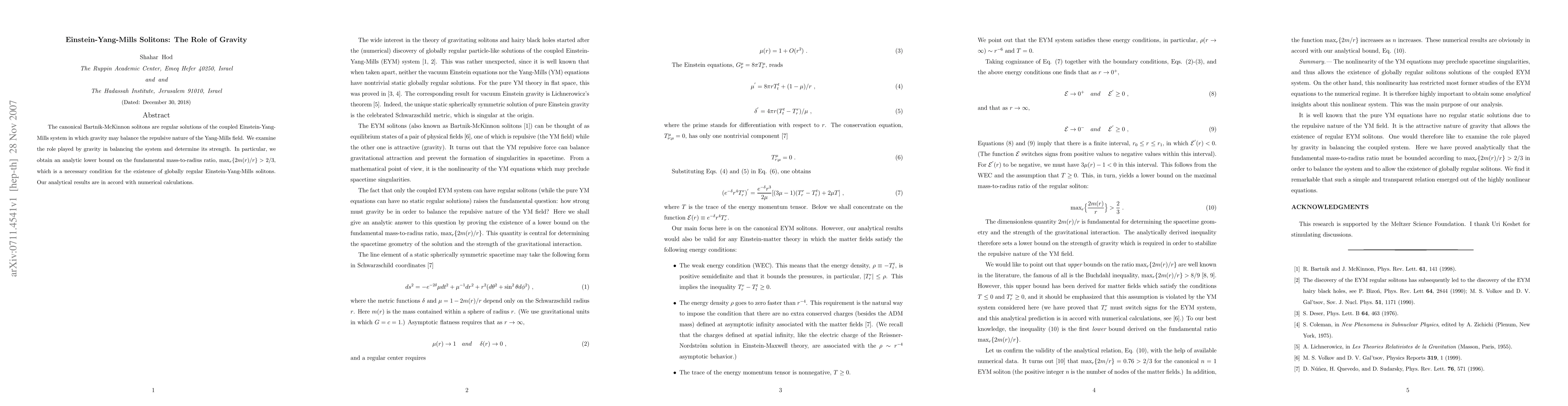 The canonical Bartnik-McKinnon solitons are regular solutions of the coupled Einstein-Yang-Mills system in which gravity may balance the repulsive nature of the Yang-Mills field. We examine the role played by gravity in balancing the system and determine its strength. In particular, we obtain an analytic lower bound on the fundamental mass-to-radius ratio, max{2m(r)/r}>2/3, which is a necessary condition for the existence of globally regular Einstein-Yang-Mills solitons. Our analytical results are in accord with numerical calculations.