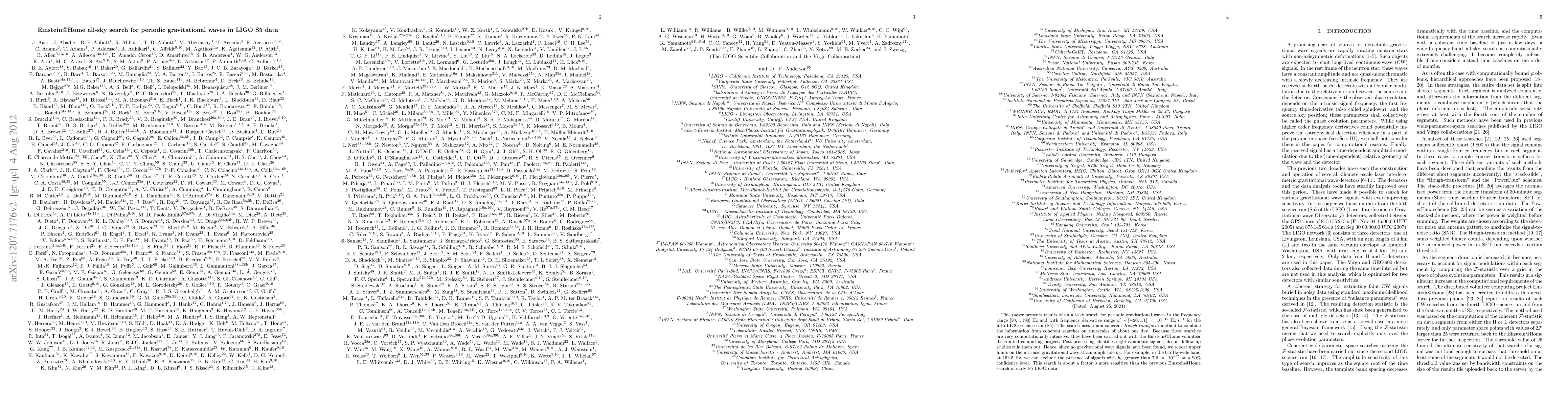 Researchers used a distributed computing project to perform an all-sky search for periodic gravitational waves in LIGO S5 data, finding eight candidates that were later ruled out through follow-up studies, setting upper limits on the intrinsic gravitational wave amplitude.