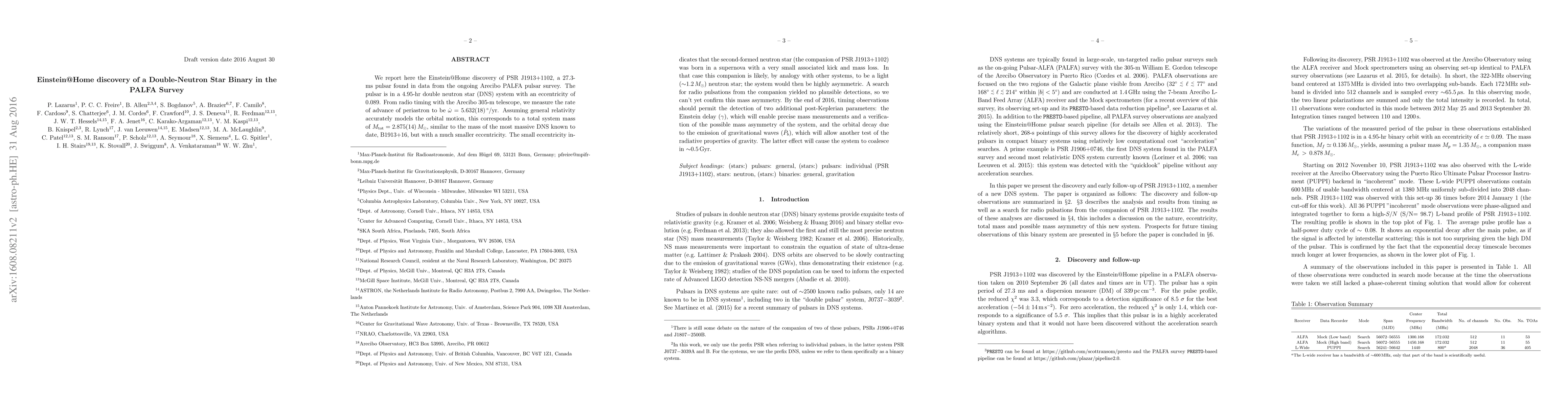 Einstein@Home discovered PSR J1913+1102, a 27.3-ms pulsar in a 4.95-hr double neutron star binary with low eccentricity. The system's mass is 2.875 solar masses, suggesting a highly asymmetric configuration with a likely light companion neutron star.