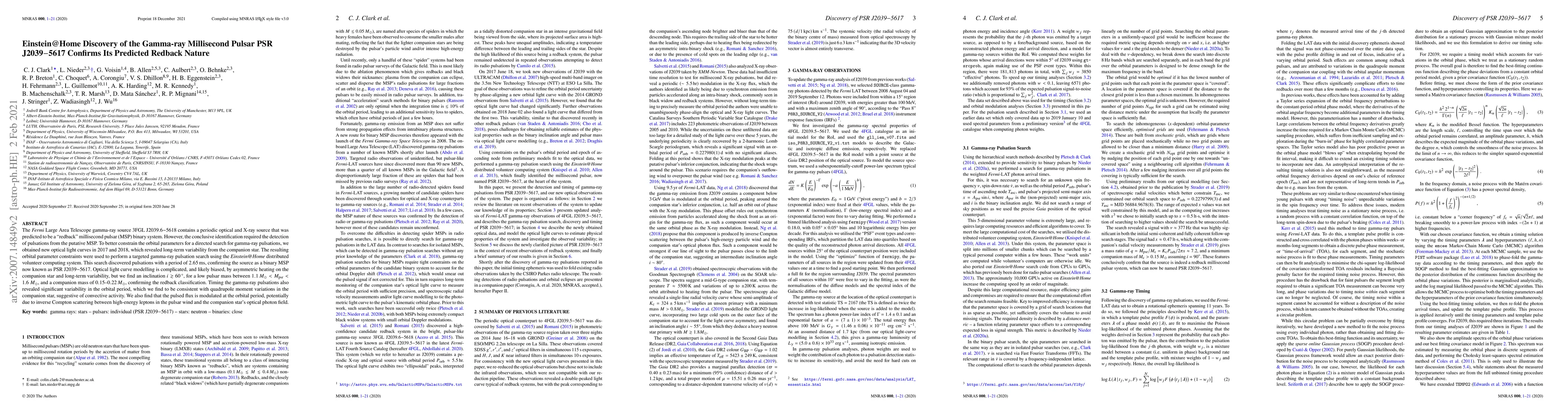 The Einstein@Home project confirmed the redback nature of the gamma-ray millisecond pulsar PSR J2039-5617, previously identified as a candidate based on optical and X-ray observations. The discovery of 2.65 ms pulsations in gamma-ray data validated its classification and provided insights into the system's orbital dynamics and companion star activity.