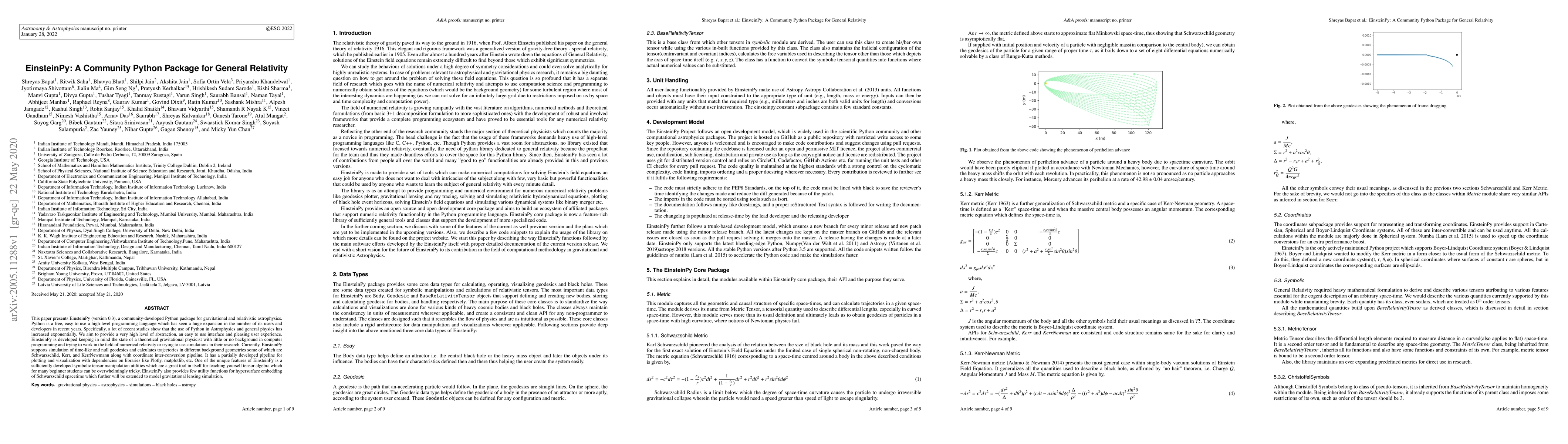 EinsteinPy is a Python package designed for gravitational and relativistic astrophysics, offering high-level abstraction and an easy interface for users with minimal programming background. It supports simulations of geodesics and tensor manipulation, with plans for extended visualization and gravitational lensing modeling.