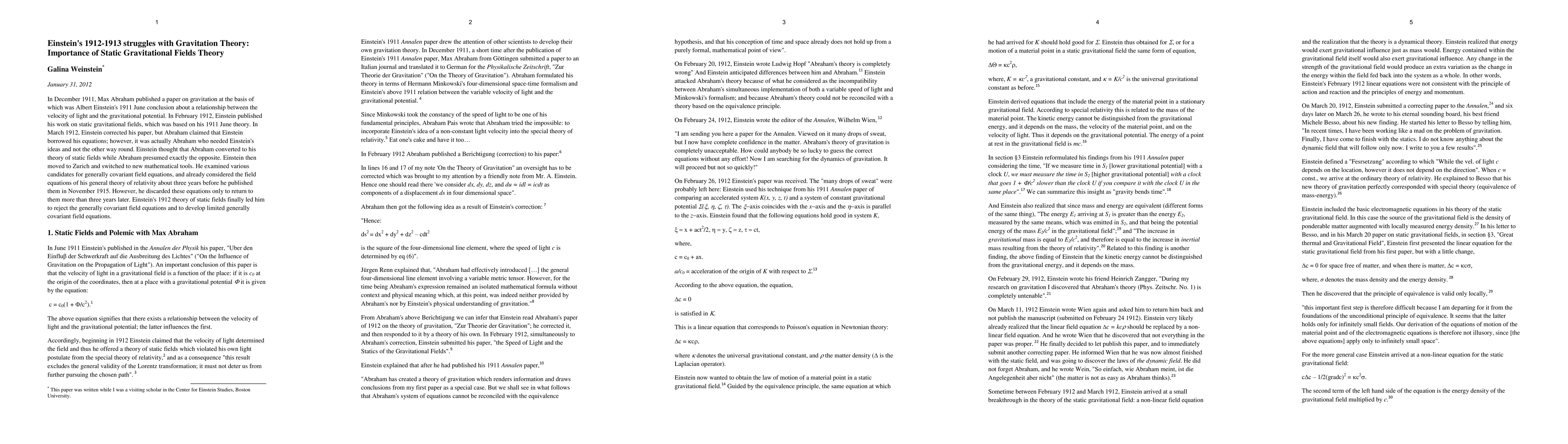 In December 1911, Max Abraham published a paper on gravitation at the basis of which was Albert Einstein's 1911 June conclusion about a relationship between the velocity of light and the gravitational potential. In February 1912, Einstein published his work on static gravitational fields, which was based on his 1911 June theory. In March 1912, Einstein corrected his paper, but Abraham claimed that Einstein borrowed his equations; however, it was actually Abraham who needed Einstein's ideas and not the other way round. Einstein thought that Abraham converted to his theory of static fields while Abraham presumed exactly the opposite. Einstein then moved to Zurich and switched to new mathematical tools. He examined various candidates for generally covariant field equations, and already considered the field equations of his general theory of relativity about three years before he published them in November 1915. However, he discarded these equations only to return to them more than three years later. Einstein's 1912 theory of static fields finally led him to reject the generally covariant field equations and to develop limited generally covariant field equations.