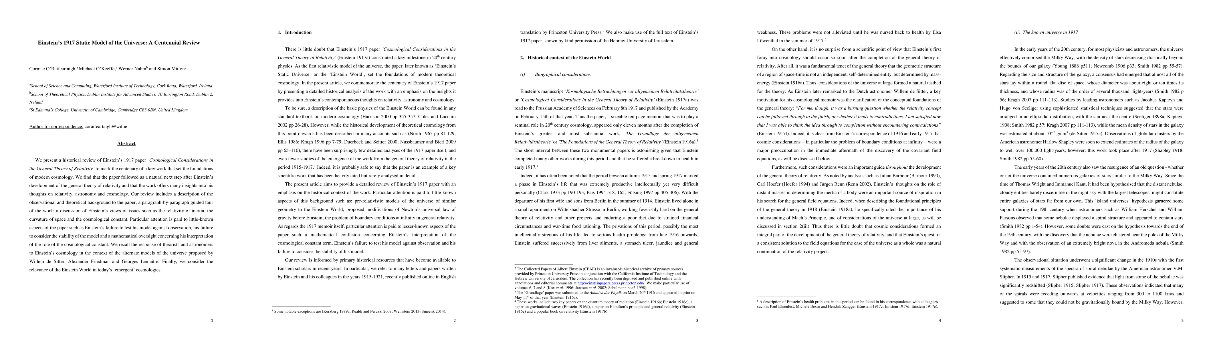 We present a historical review of Einstein's 1917 paper 'Cosmological Considerations in the General Theory of Relativity' to mark the centenary of a key work that set the foundations of modern cosmology. We find that the paper followed as a natural next step after Einstein's development of the general theory of relativity and that the work offers many insights into his thoughts on relativity, astronomy and cosmology. Our review includes a description of the observational and theoretical background to the paper; a paragraph-by-paragraph guided tour of the work; a discussion of Einstein's views of issues such as the relativity of inertia, the curvature of space and the cosmological constant. Particular attention is paid to little-known aspects of the paper such as Einstein's failure to test his model against observation, his failure to consider the stability of the model and a mathematical oversight concerning his interpretation of the role of the cosmological constant. We recall the response of theorists and astronomers to Einstein's cosmology in the context of the alternate models of the universe proposed by Willem de Sitter, Alexander Friedman and Georges Lemaitre. Finally, we describe the relevance of the Einstein World in today's 'emergent' cosmologies.