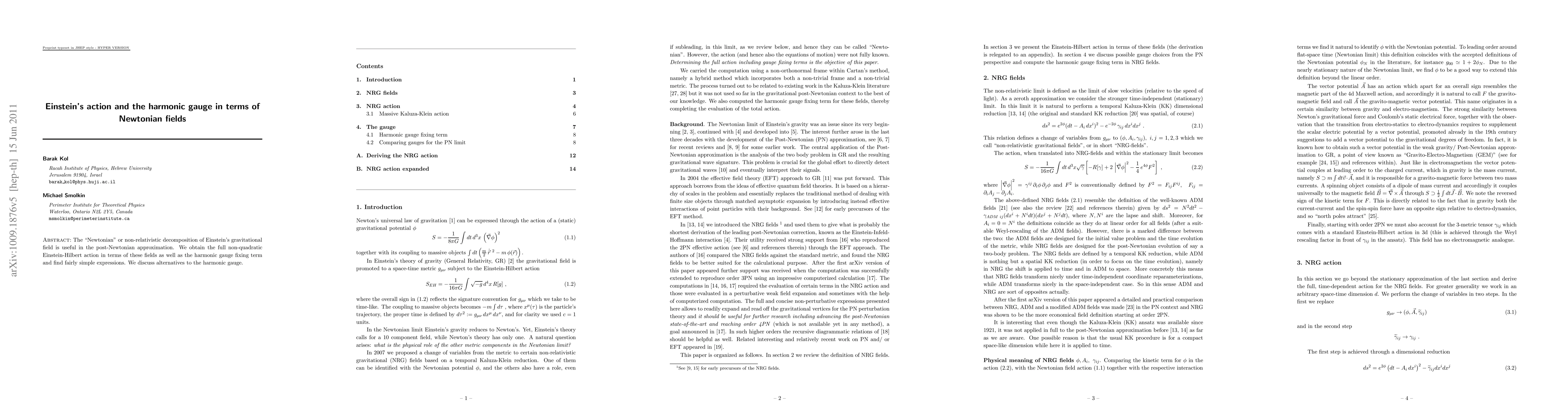 The "Newtonian" or non-relativistic decomposition of Einstein's gravitational field is useful in the post-Newtonian approximation. We obtain the full non-quadratic Einstein-Hilbert action in terms of these fields as well as the harmonic gauge fixing term and find fairly simple expressions. We discuss alternatives to the harmonic gauge.