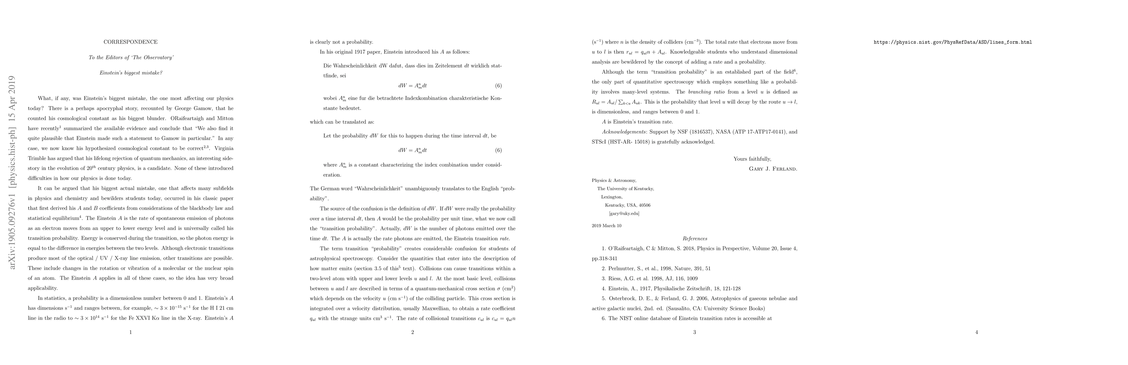What, if any, was Einstein's biggest mistake, the one most affecting our physics today? There is a perhaps apocryphal story, recounted by George Gamow, that he counted his cosmological constant as his biggest blunder. We now know his hypothesized cosmological constant to be correct. His lifelong rejection of quantum mechanics, an interesting side-story in the evolution of 20th-century physics, is a candidate. None of these introduced difficulties in how our physics is done today. It can be argued that his biggest actual mistake, one that affects many subfields of physics and chemistry and bewilders students today, occurred in his naming of his A and B coefficients.