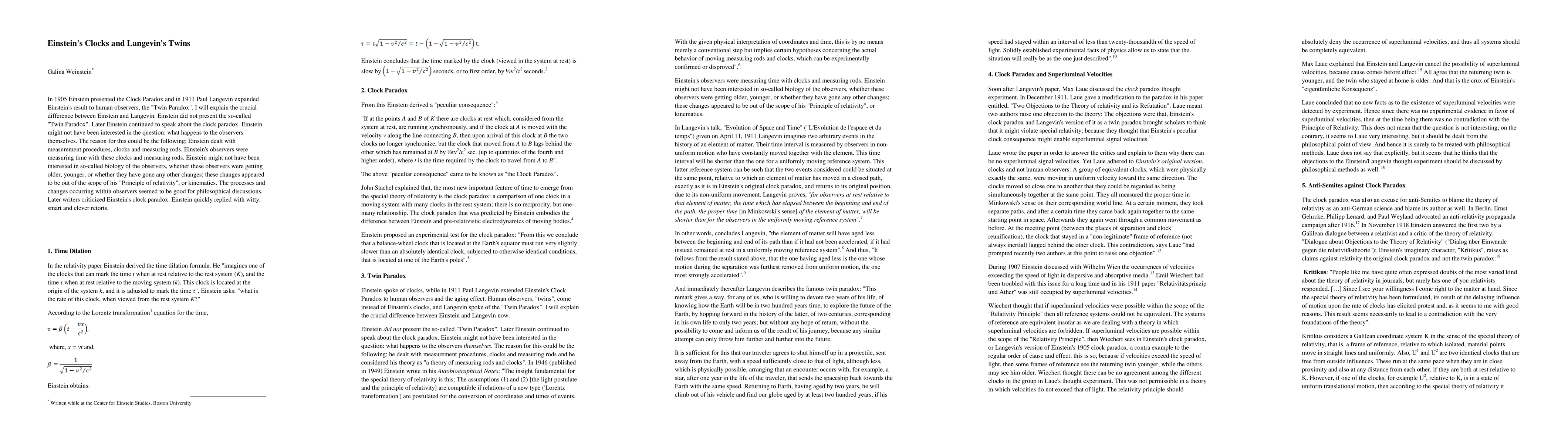 In 1905 Einstein presented the Clock Paradox and in 1911 Paul Langevin expanded Einstein's result to human observers, the "Twin Paradox." I will explain the crucial difference between Einstein and Langevin. Einstein did not present the so-called "Twin Paradox." Later Einstein continued to speak about the clock paradox. Einstein might not have been interested in the question: what happens to the observers themselves. The reason for this could be the following; Einstein dealt with measurement procedures, clocks and measuring rods. Einstein's observers were measuring time with these clocks and measuring rods. Einstein might not have been interested in so-called biology of the observers, whether these observers were getting older, younger, or whether they have gone any other changes; these changes appeared to be out of the scope of his "Principle of relativity" or kinematics. The processes and changes occurring within observers seemed to be good for philosophical discussions. Later writers criticized Einstein's clock paradox. Einstein quickly replied with witty, smart and clever retorts.