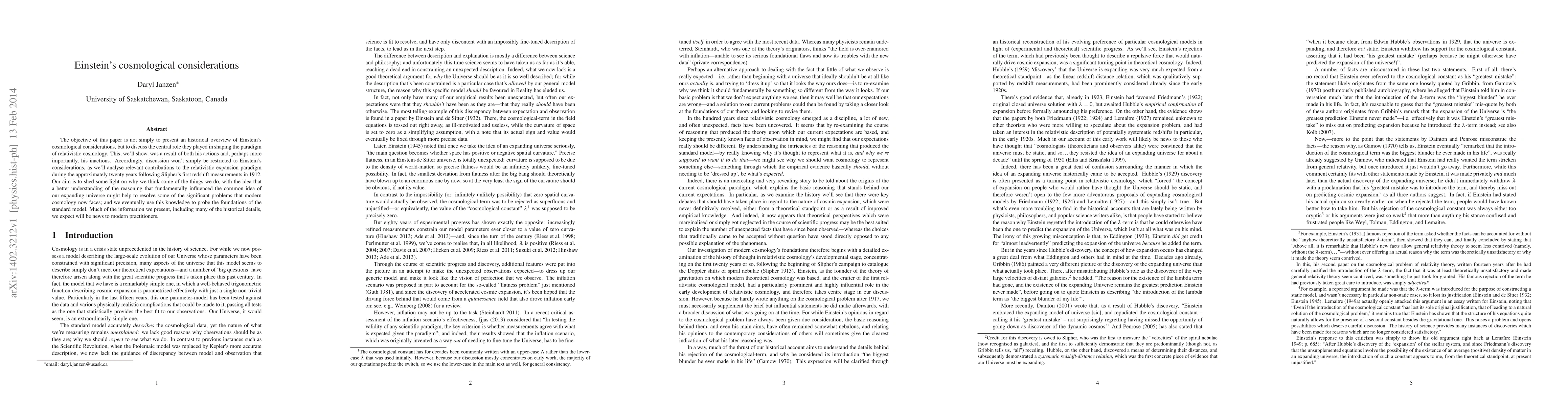 The objective of this paper is not simply to present an historical overview of Einstein's cosmological considerations, but to discuss the central role they played in shaping the paradigm of relativistic cosmology. This, we'll show, was a result of both his actions and, perhaps more importantly, his inactions. Accordingly, discussion won't simply be restricted to Einstein's considerations, as we'll analyse relevant contributions to the relativistic expansion paradigm during the approximately twenty years following Slipher's first redshift measurements in 1912. Our aim is to shed some light on why we think some of the things we do, with the idea that a better understanding of the reasoning that fundamentally influenced the common idea of our expanding universe might help to resolve some of the significant problems that modern cosmology now faces; and we eventually use this knowledge to probe the foundations of the standard model. Much of the information we present, including many of the historical details, we expect will be news to modern practitioners.
