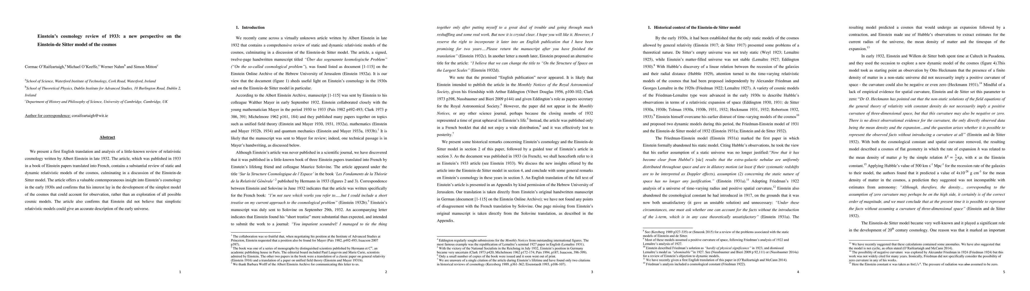 This paper presents the first English translation of a 1933 review by Einstein on relativistic cosmology, highlighting his focus on the simplest models that match observations, particularly the Einstein-de Sitter model, while noting his skepticism about their applicability to the early universe.