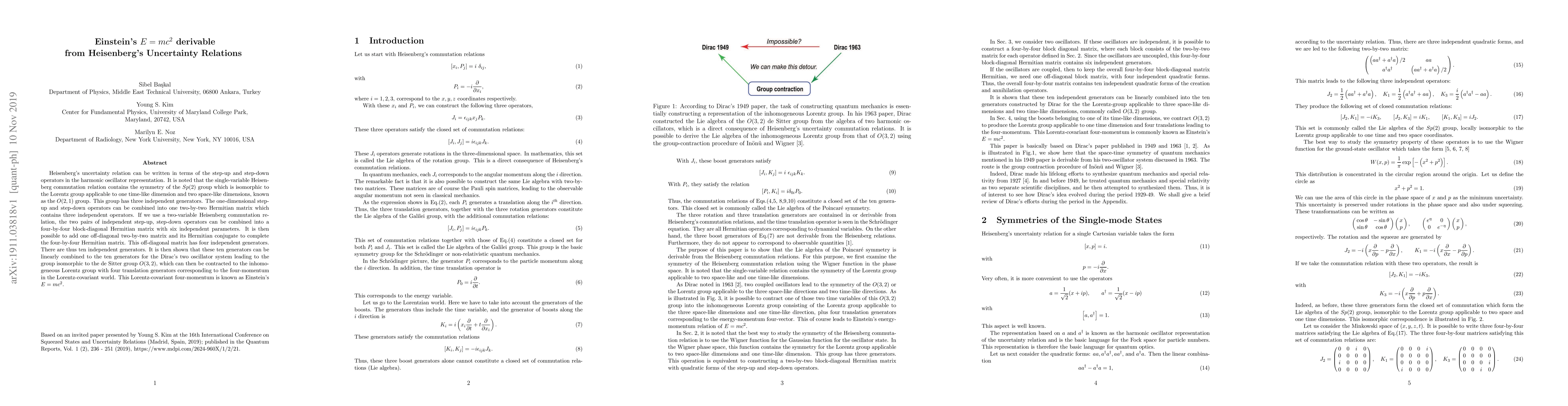 Heisenberg's uncertainty relation can be written in terms of the step-up and step-down operators in the harmonic oscillator representation. It is noted that the single-variable Heisenberg commutation relation contains the symmetry of the Sp(2) group which is isomorphic to the Lorentz group applicable to one time-like dimension and two space-like dimensions, known as the O(2,1) group. This group has three independent generators. The one-dimensional step-up and step-down operators can be combined into one two-by-two Hermitian matrix which contains three independent operators. If we use a two-variable Heisenberg commutation relation, the two pairs of independent step-up, step-down operators can be combined into a four-by-four block-diagonal Hermitian matrix with six independent parameters. It is then possible to add one off-diagonal two-by-two matrix and its Hermitian conjugate to complete the four-by-four Hermitian matrix. This off-diagonal matrix has four independent generators. There are thus ten independent generators. It is then shown that these ten generators can be linearly combined to the ten generators for the Dirac's two oscillator system leadingto the group isomorphic to the de Sitter group O(3,2), which can the be contracted to the inhomogeneous Lorentz group with four translation generators corresponding to the four-momentum in the Lorentz-covariant world. This Lorentz-covariant four-momentum is known as Einstein's E = mc^2.