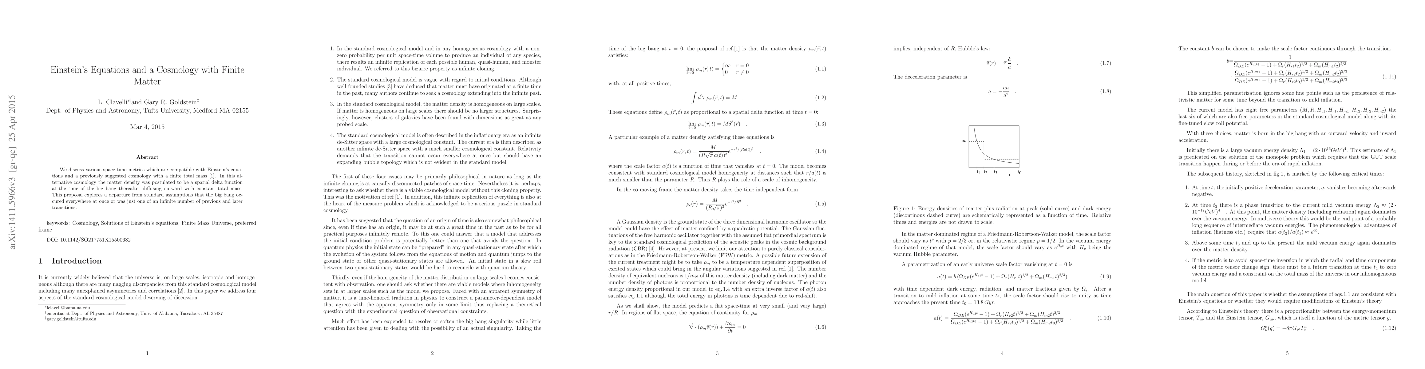 The paper explores various space-time metrics compatible with Einstein's equations and a cosmology with finite total mass, proposing a model where matter density is a spatial delta function at the big bang, diffusing outward with constant total mass.