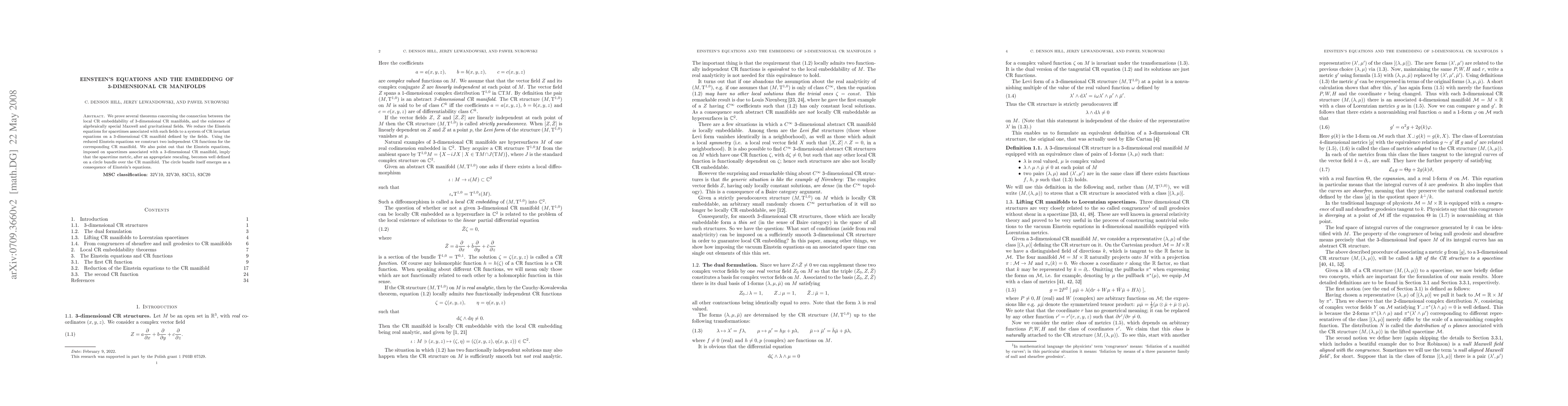 We prove several theorems concerning the connection between the local CR embeddability of 3-dimensional CR manifolds, and the existence of algebraically special Maxwell and gravitational fields. We reduce the Einstein equations for spacetimes associated with such fields to a system of CR invariant equations on a 3-dimensional CR manifold defined by the fields. Using the reduced Einstein equations we construct two independent CR functions for the corresponding CR manifold. We also point out that the Einstein equations, imposed on spacetimes associated with a 3-dimensional CR manifold, imply that the spacetime metric, after an appropriate rescaling, becomes well defined on a circle bundle over the CR manifold. The circle bundle itself emerges as a consequence of Einstein's equations.