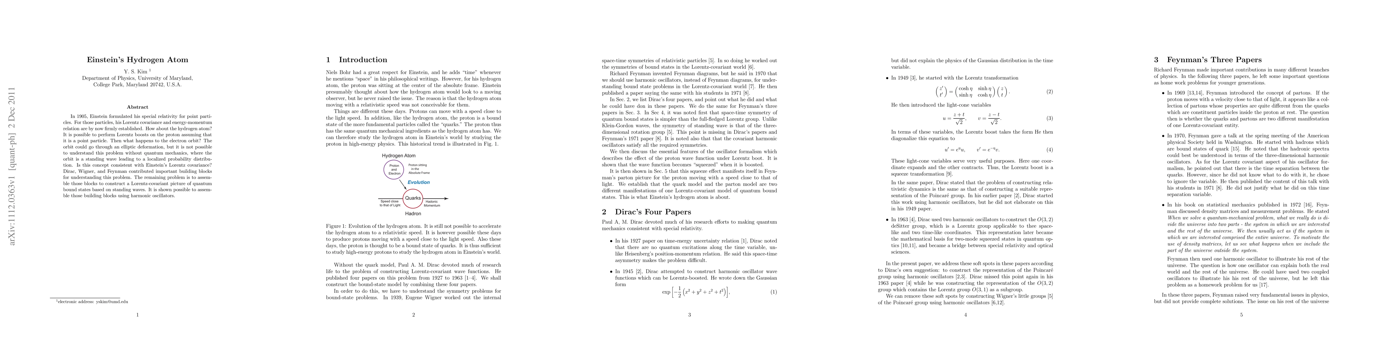 In 1905, Einstein formulated his special relativity for point particles. For those particles, his Lorentz covariance and energy-momentum relation are by now firmly established. How about the hydrogen atom? It is possible to perform Lorentz boosts on the proton assuming that it is a point particle. Then what happens to the electron orbit? The orbit could go through an elliptic deformation, but it is not possible to understand this problem without quantum mechanics, where the orbit is a standing wave leading to a localized probability distribution. Is this concept consistent with Einstein's Lorentz covariance? Dirac, Wigner, and Feynman contributed important building blocks for understanding this problem. The remaining problem is to assemble those blocks to construct a Lorentz-covariant picture of quantum bound states based on standing waves. It is shown possible to assemble those building blocks using harmonic oscillators.