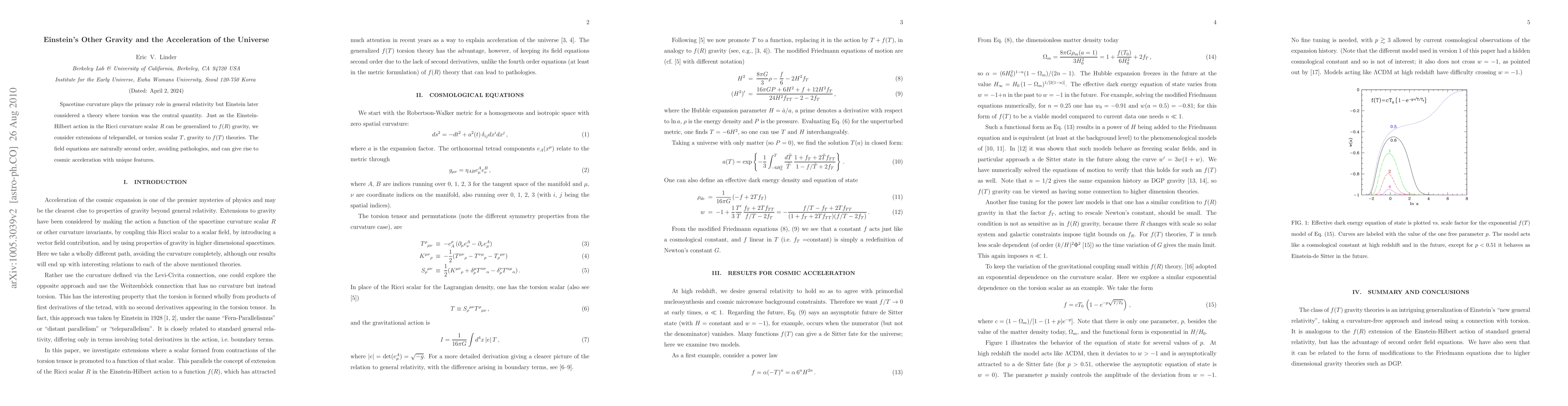 Spacetime curvature plays the primary role in general relativity but Einstein later considered a theory where torsion was the central quantity. Just as the Einstein-Hilbert action in the Ricci curvature scalar R can be generalized to f(R) gravity, we consider extensions of teleparallel, or torsion scalar T, gravity to f(T) theories. The field equations are naturally second order, avoiding pathologies, and can give rise to cosmic acceleration with unique features.